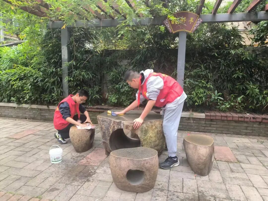 “睦邻亭”是社区居民间情感交流的纽带,是放松休闲的好地方。小志愿者们带着桶和抹布对进行“睦邻亭”进行清洁,让它变得更加干净整洁。