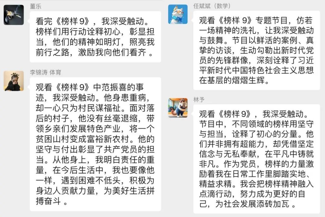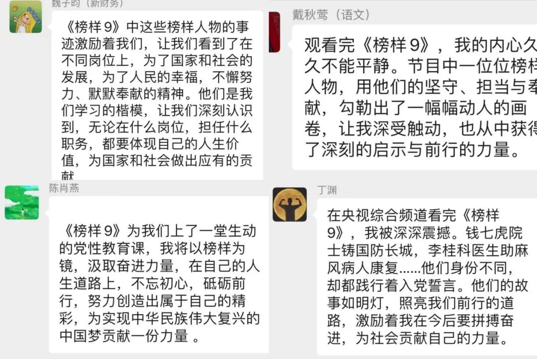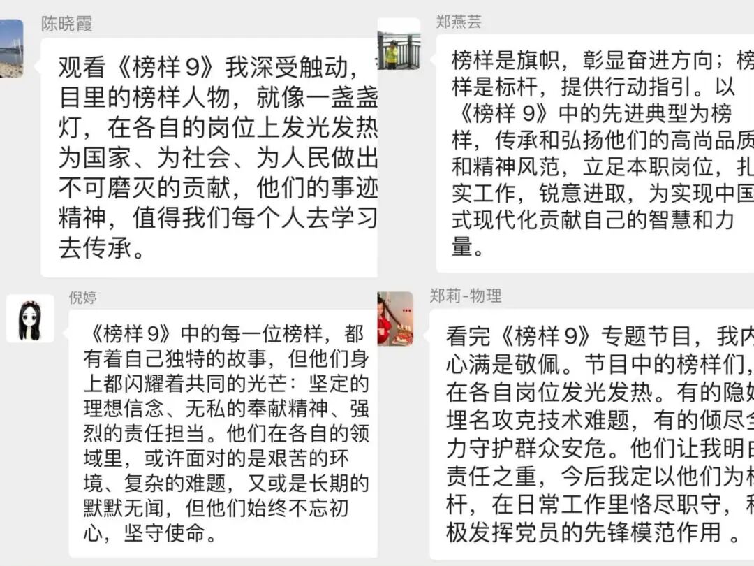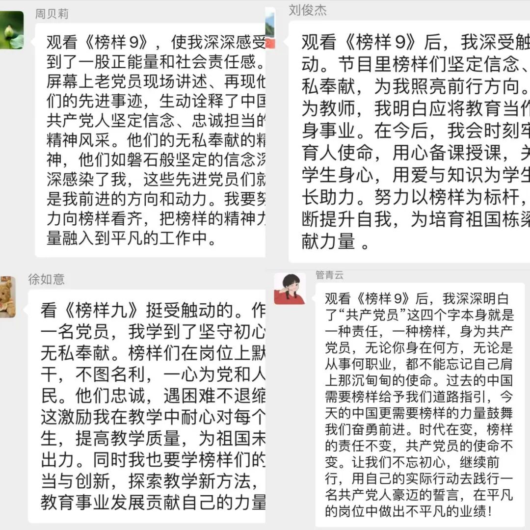 为深入学习贯彻习近平新时代中国特色社会主义思想和党的二十届三中全会精神,充分发挥先进典型示范引领作用,教育引导我校党员教师“学有榜样、赶有方向”,在全校营造崇尚先进、见贤思齐的浓厚氛围。2025年1月16日晚8:00,我校党总支组织全体党员居家观看了由中央组织部、中央广播电视总台联合制作了《榜样9》专题节目。
