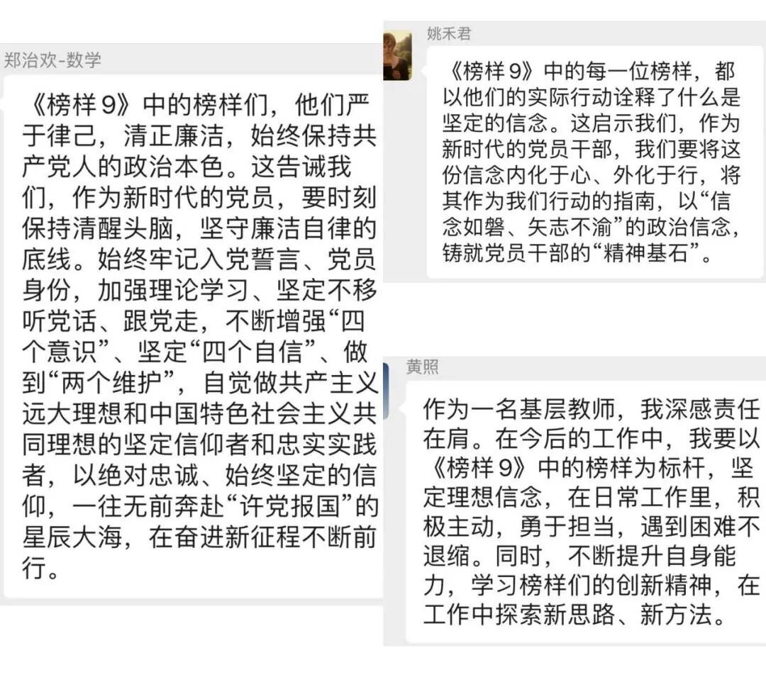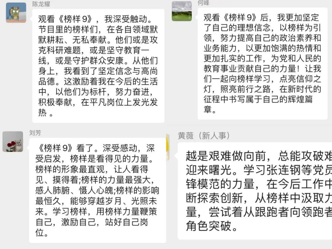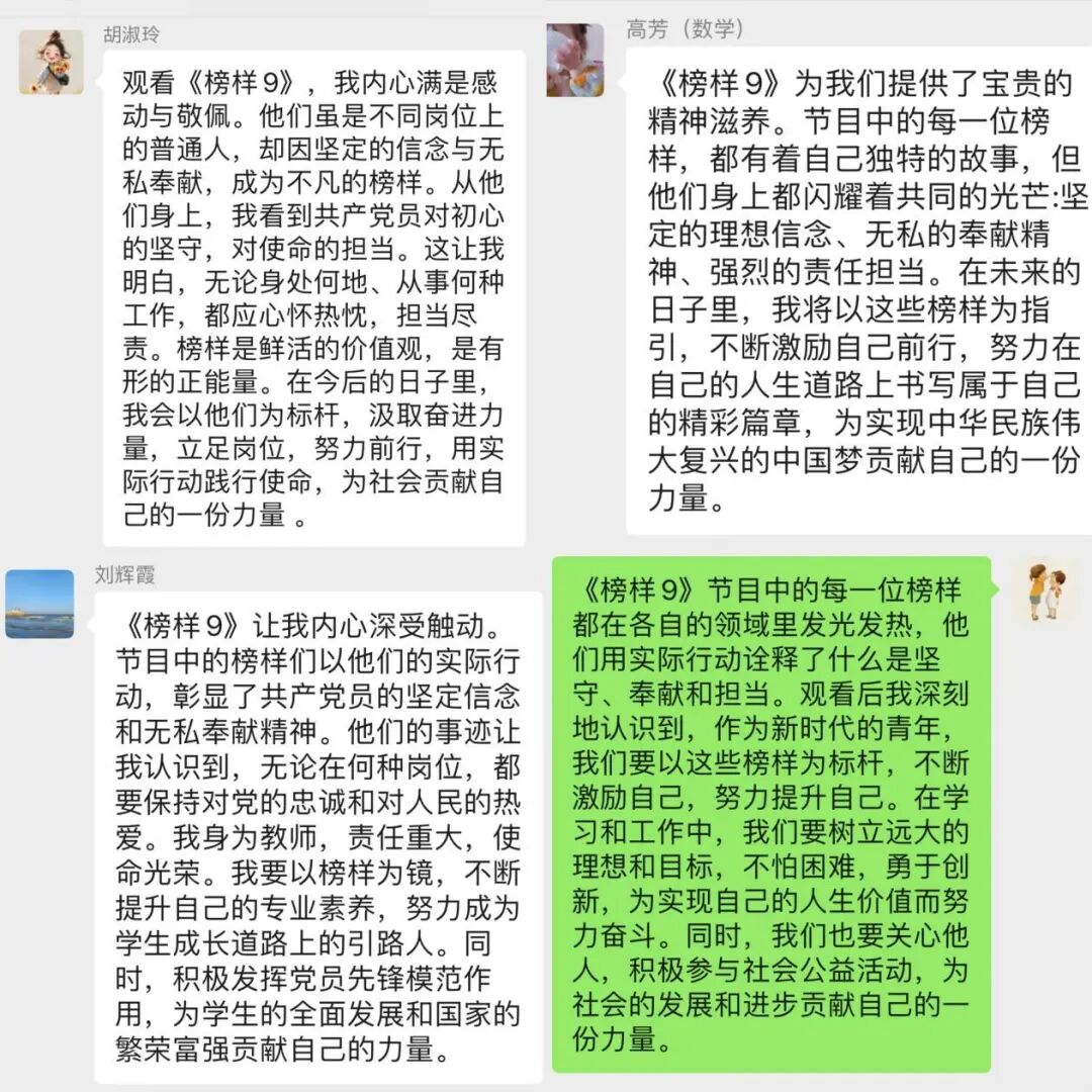 为深入学习贯彻习近平新时代中国特色社会主义思想和党的二十届三中全会精神,充分发挥先进典型示范引领作用,教育引导我校党员教师“学有榜样、赶有方向”,在全校营造崇尚先进、见贤思齐的浓厚氛围。2025年1月16日晚8:00,我校党总支组织全体党员居家观看了由中央组织部、中央广播电视总台联合制作了《榜样9》专题节目。