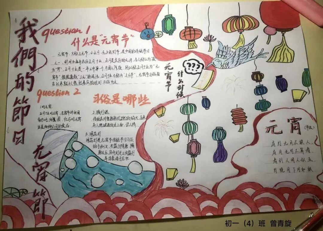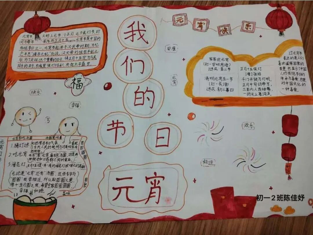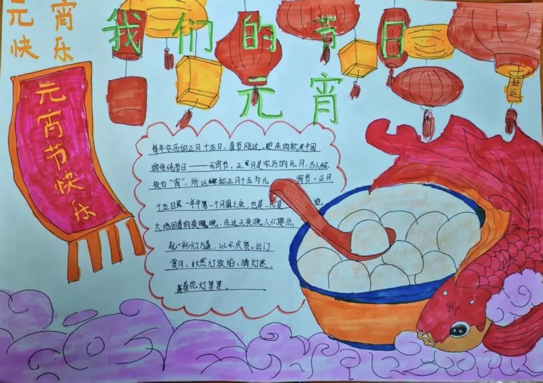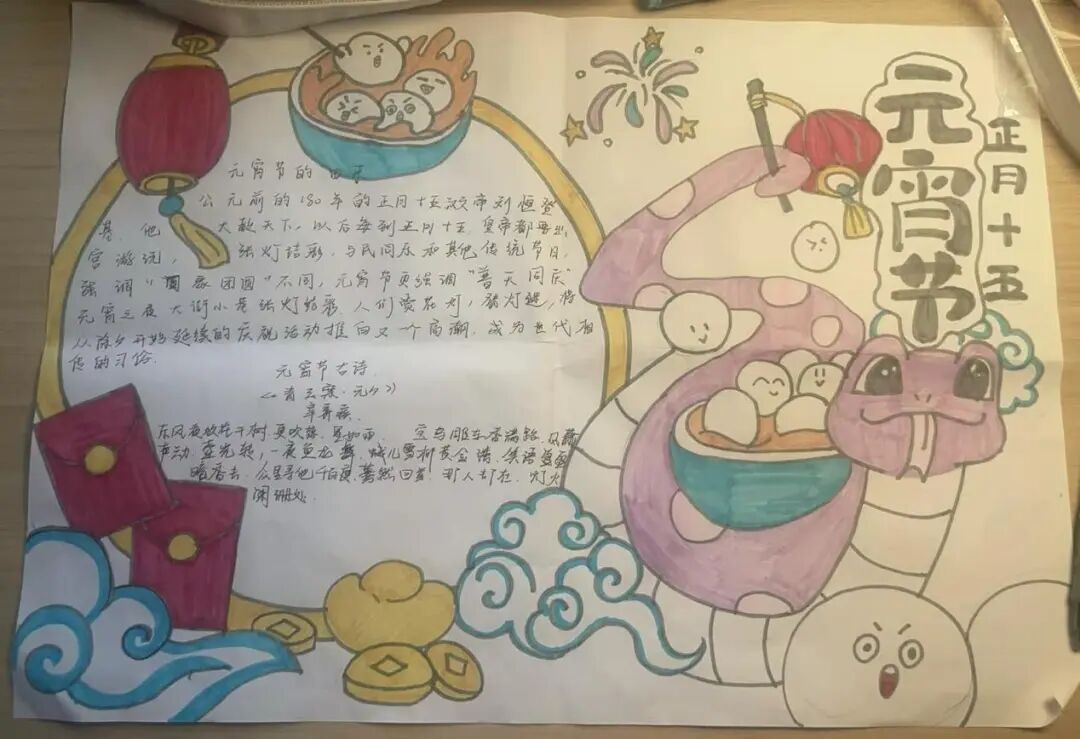 学生通过收集元宵节的由来、风俗习惯、文化活动等内容,精心设计了一幅幅图文并茂、多彩生动的手抄报。一幅幅精美的手抄报,展现了同学们对传统文化的热爱和对美好生活的向往。