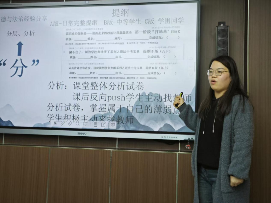 道法集备组长管青云老师提出了“集”“验”“分”“享”四字经验,细化集备,分层提纲,注意落实小测、练习,紧跟时事,因材施教。