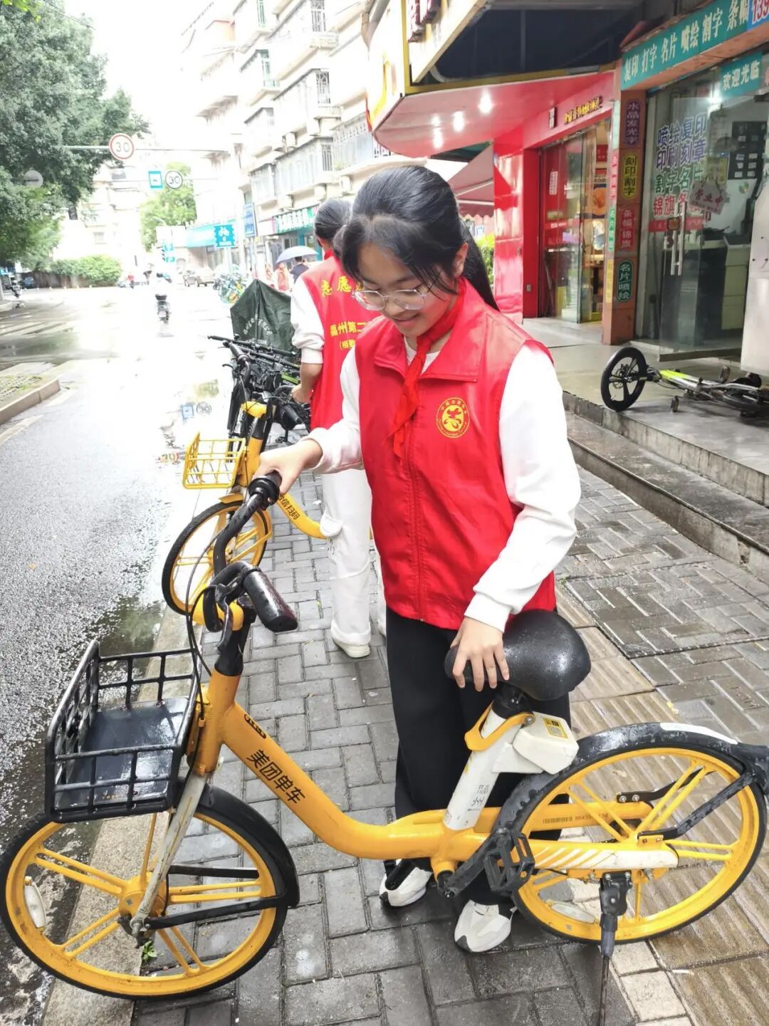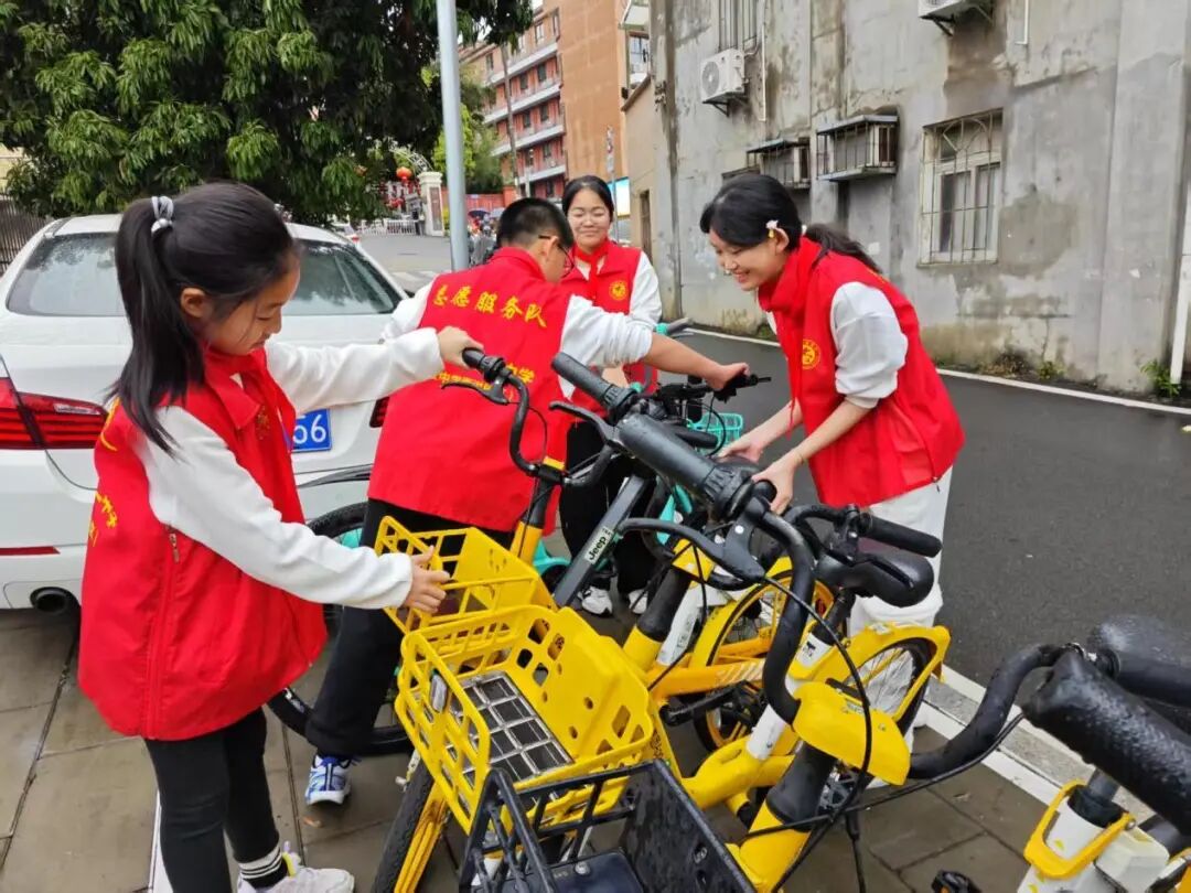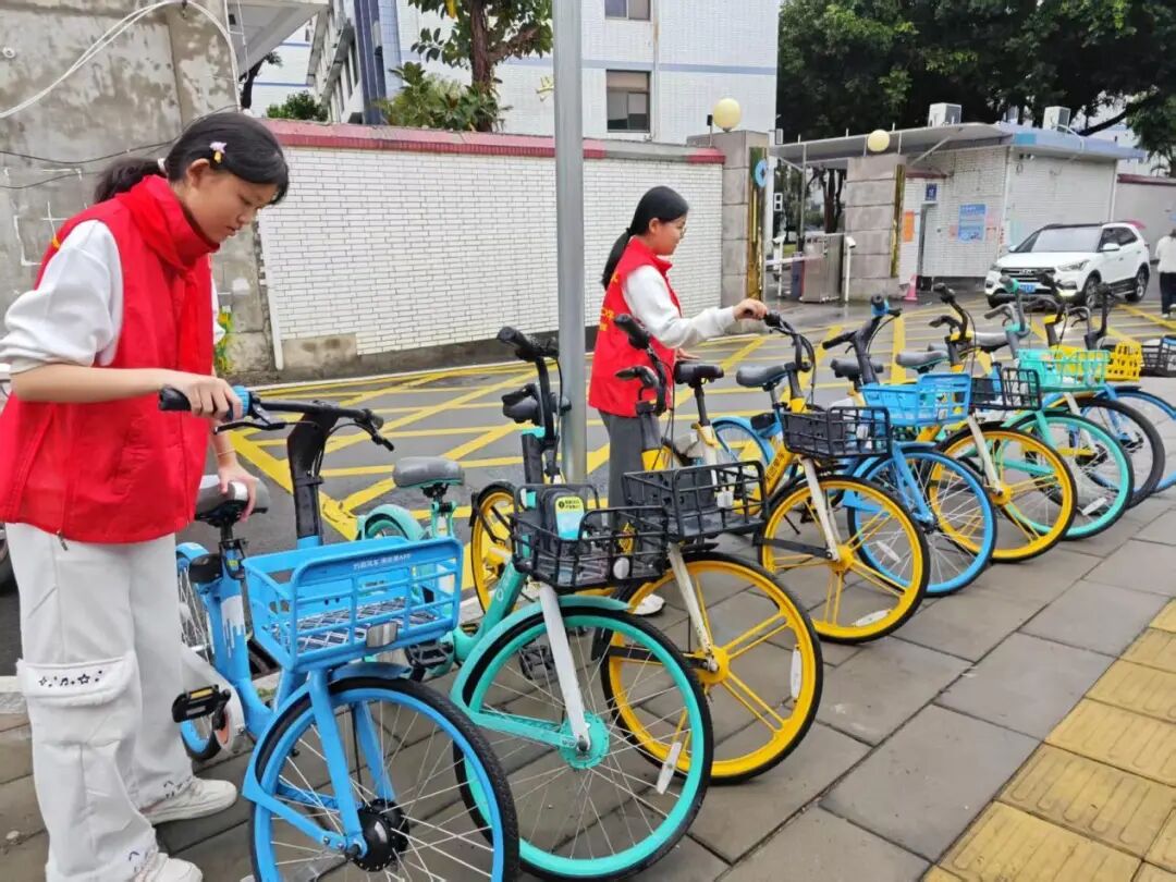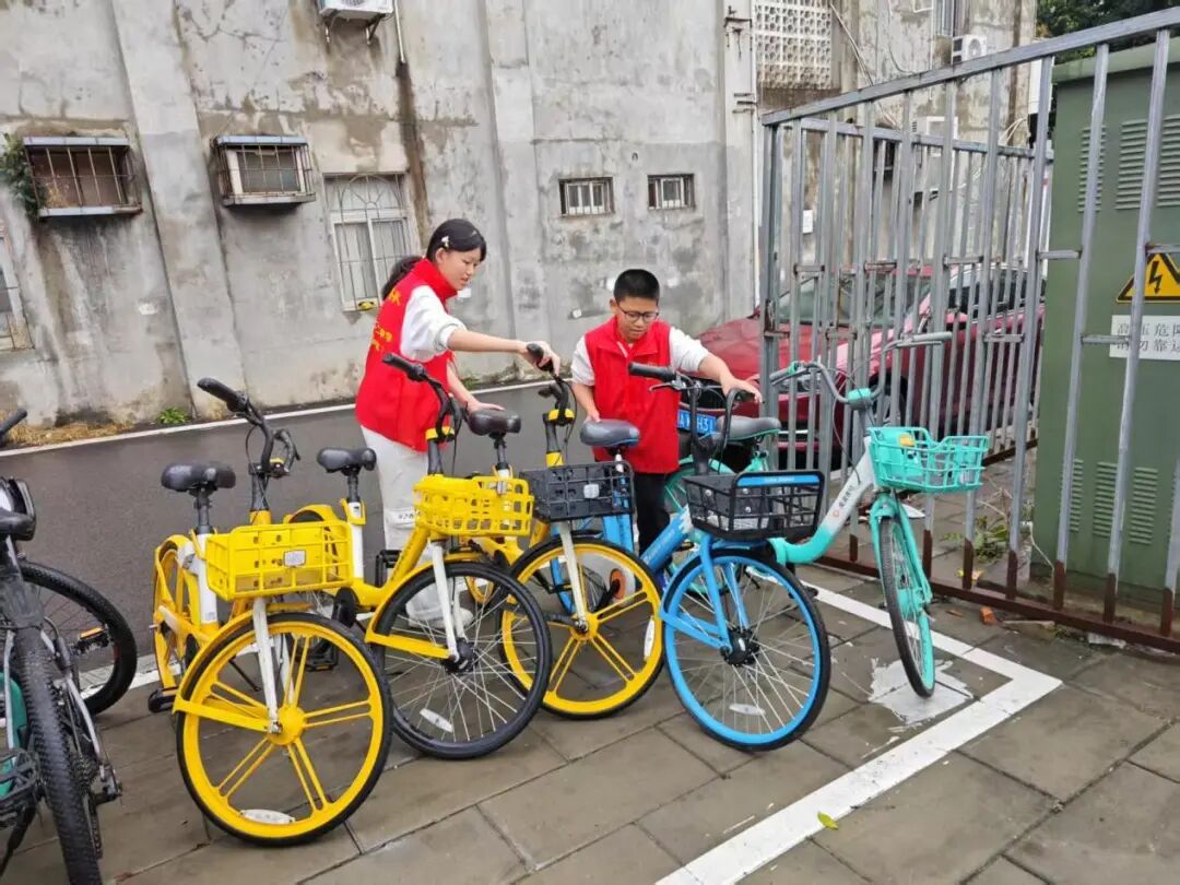 街道两旁,共享单车随意停放的现象较为严重,影响了市容市貌和交通秩序。同学们迅速行动起来,分成几个小组,将乱停乱放的共享单车搬至指定区域,整齐地摆放在一起。他们互相配合,有的负责搬运,有的负责调整车把方向,确保单车停放规范、整齐。经过同学们辛勤劳动,原本杂乱无章的街道变得井然有序,共享单车整齐地排列在路边,成为了一道亮丽的风景线。