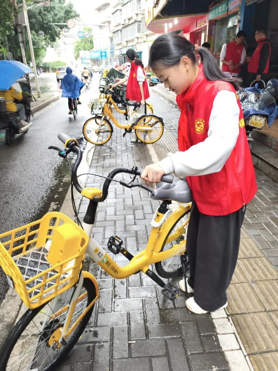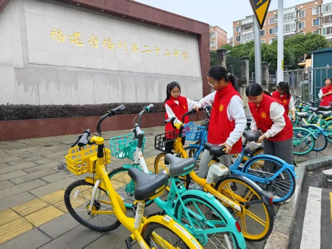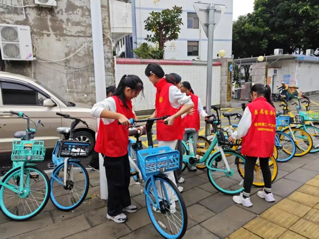 街道两旁,共享单车随意停放的现象较为严重,影响了市容市貌和交通秩序。同学们迅速行动起来,分成几个小组,将乱停乱放的共享单车搬至指定区域,整齐地摆放在一起。他们互相配合,有的负责搬运,有的负责调整车把方向,确保单车停放规范、整齐。经过同学们辛勤劳动,原本杂乱无章的街道变得井然有序,共享单车整齐地排列在路边,成为了一道亮丽的风景线。