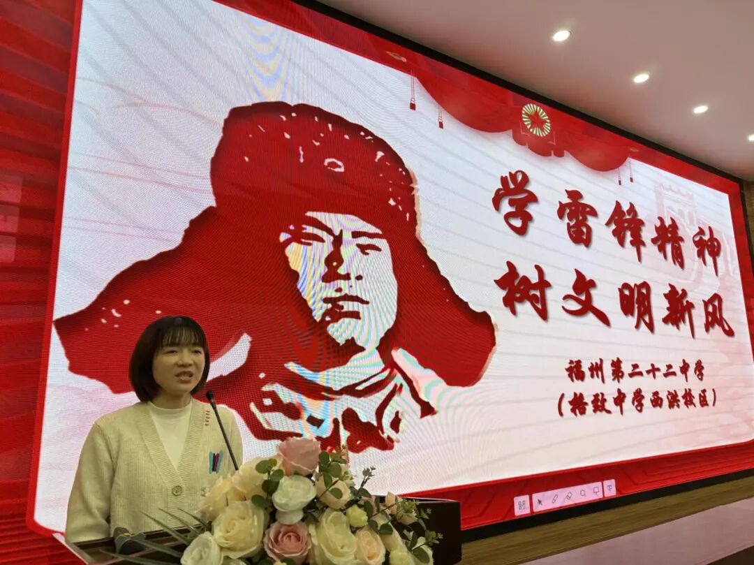 德育处主任陈晓霞老师在升旗仪式上表示作为新时代的青年,我们要以雷锋为榜样,将个人的奋斗融入到国家和民族的发展大局中。在学习上,我们要发扬“钉子精神”;在生活中,我们要积极参与志愿服务和社会公益活动,从身边的小事做起,用实际行动弘扬“雷锋精神”,践行社会主义核心价值观。