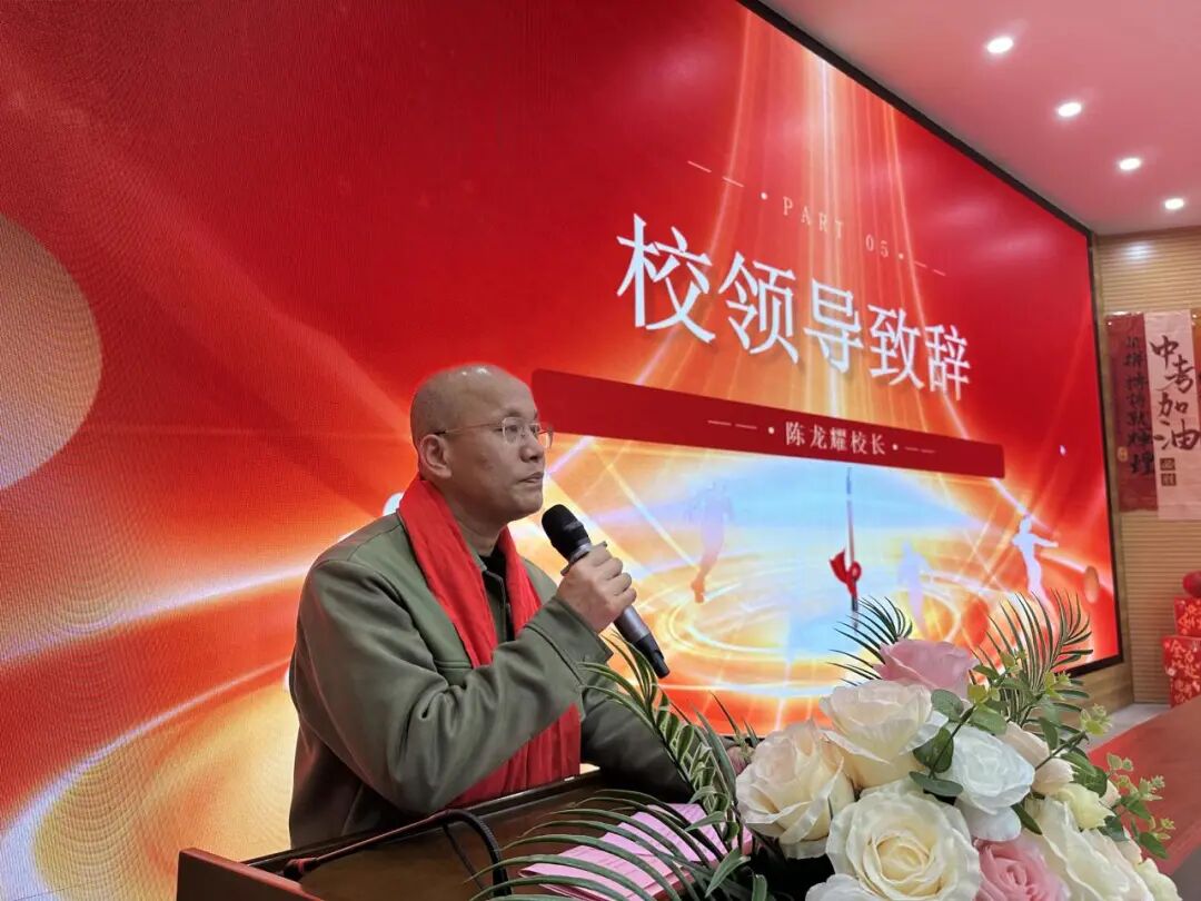 陈龙耀校长向辛勤备战中考的全体初三教师致以诚挚的敬意,向刻苦学习、努力拼搏的初三学子表示美好的祝愿。他给同学们分享了三点建议:一、锚定目标,砥砺前行;二、坚定信念,勇往直前;三、科学备考,高效冲刺。陈校长强调,成功并非偶然,而是目标清晰、步履坚定的必然结果。他鼓励全体师生坚定信念,脚踏实地,勇敢追梦。