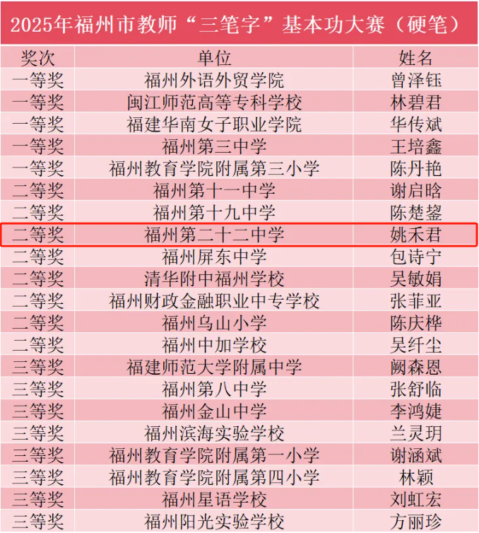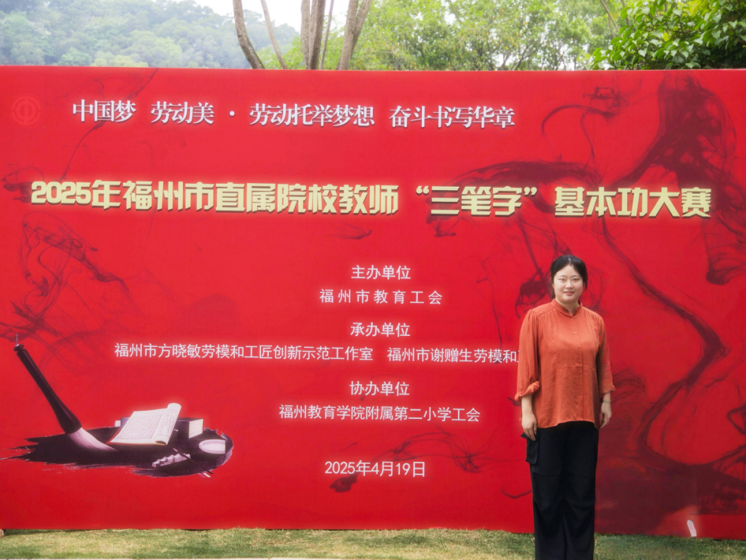 在 4 月 19 日于福州教育学院附属第二小学晋安校区举行的 2025 年福州市直属院校教师 “三笔字” 基本功大赛中,我校姚禾君老师凭借扎实的功底和出色的发挥,在硬笔组比赛中脱颖而出,荣获二等奖!