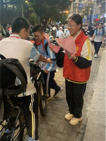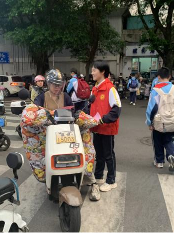 校门口倡议,共筑骑行安全防线。理论学习之后,同学们将所学知识转化为实际行动。2025年4月10日,初二(1)班同学组成志愿小分队,身着统一的志愿服,手捧精心准备的《关于骑自行车、电动车、摩托车安全倡议书》,来到了校门口这一骑行者的必经之地。“您好,请佩戴头盔,安全骑行!”志愿者们用亲切的话语和温暖的笑容,向每一位路过的车主递上倡议书。倡议书中详细列举了骑行安全的注意事项,特别强调了佩戴头盔的重要性。同时,还提醒车主们要遵守交通规则,文明骑行,共同营造安全、有序的骑行环境。