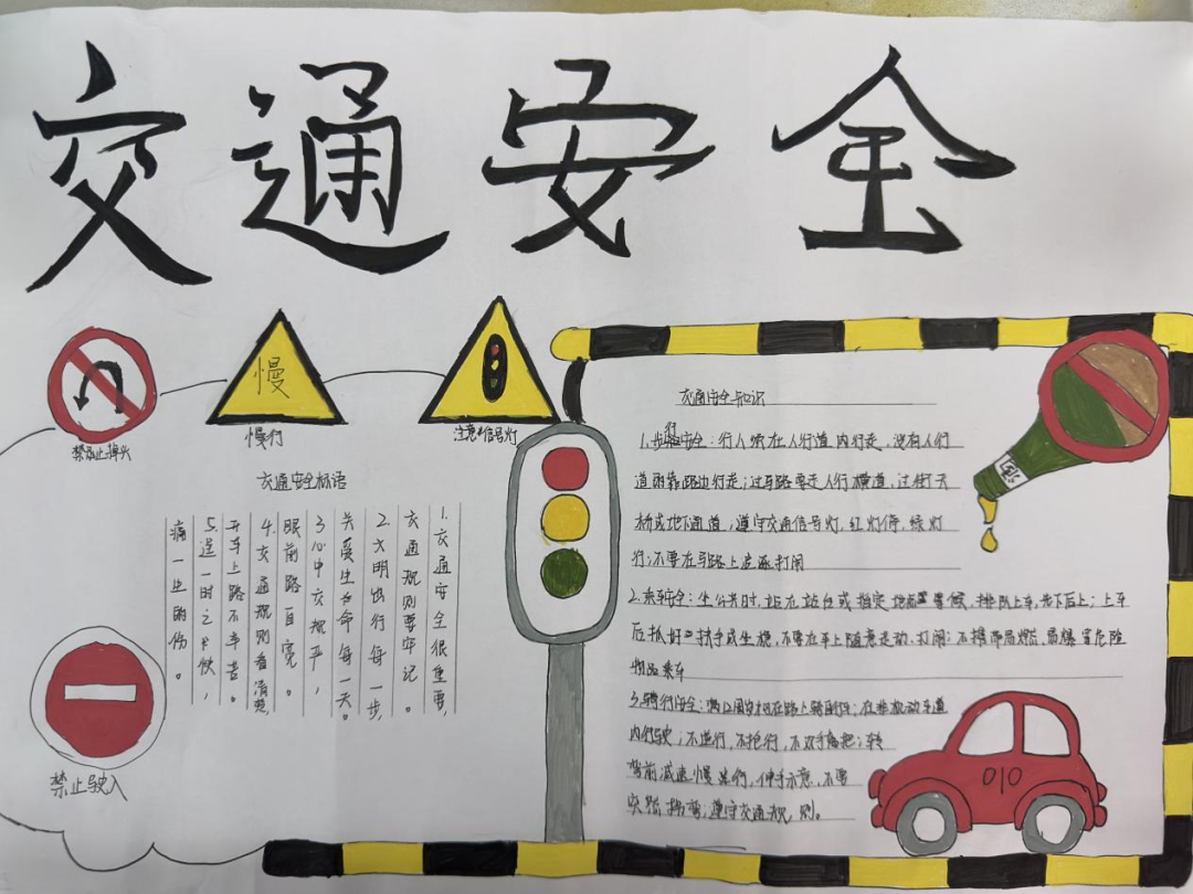 各班级精心策划、制作了以交通安全为主题的黑板报。板报内容丰富,包括交通法规、安全提示、事故案例等,图文并茂,生动形象。黑板报成为了班级交通安全宣传的重要阵地,起到了良好的宣传教育效果。