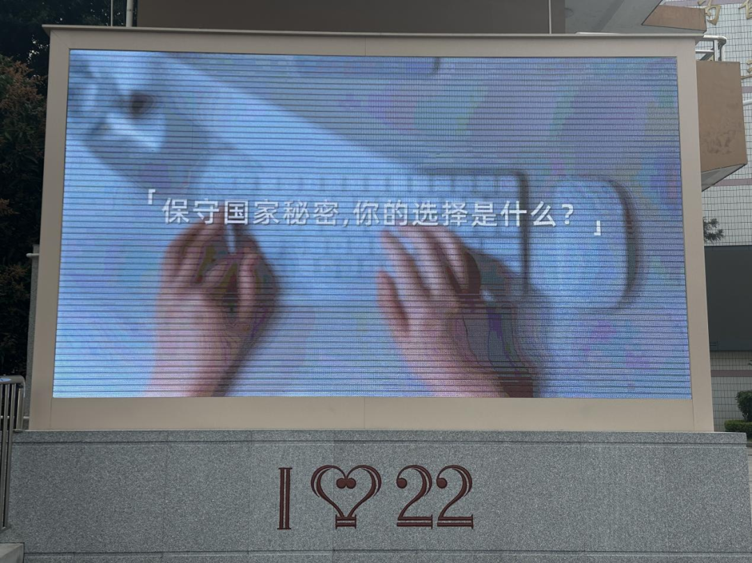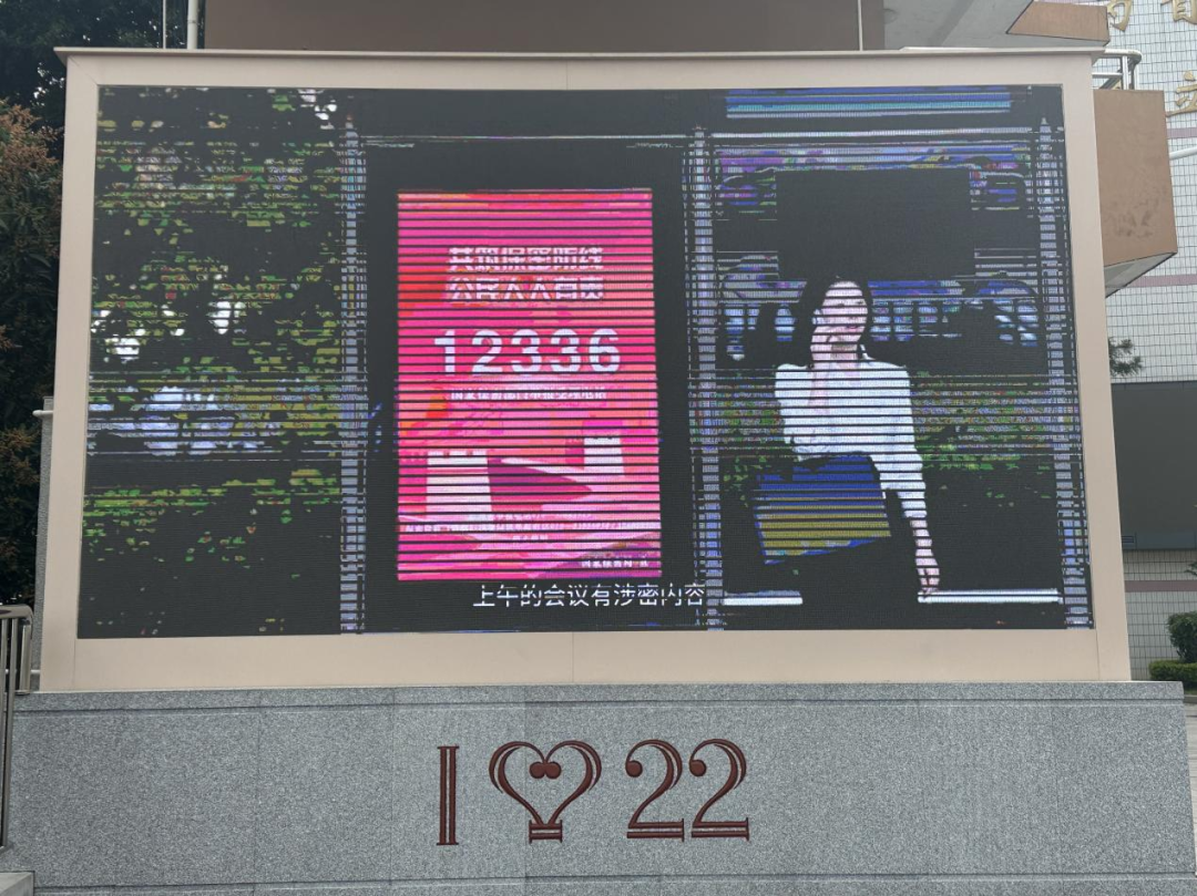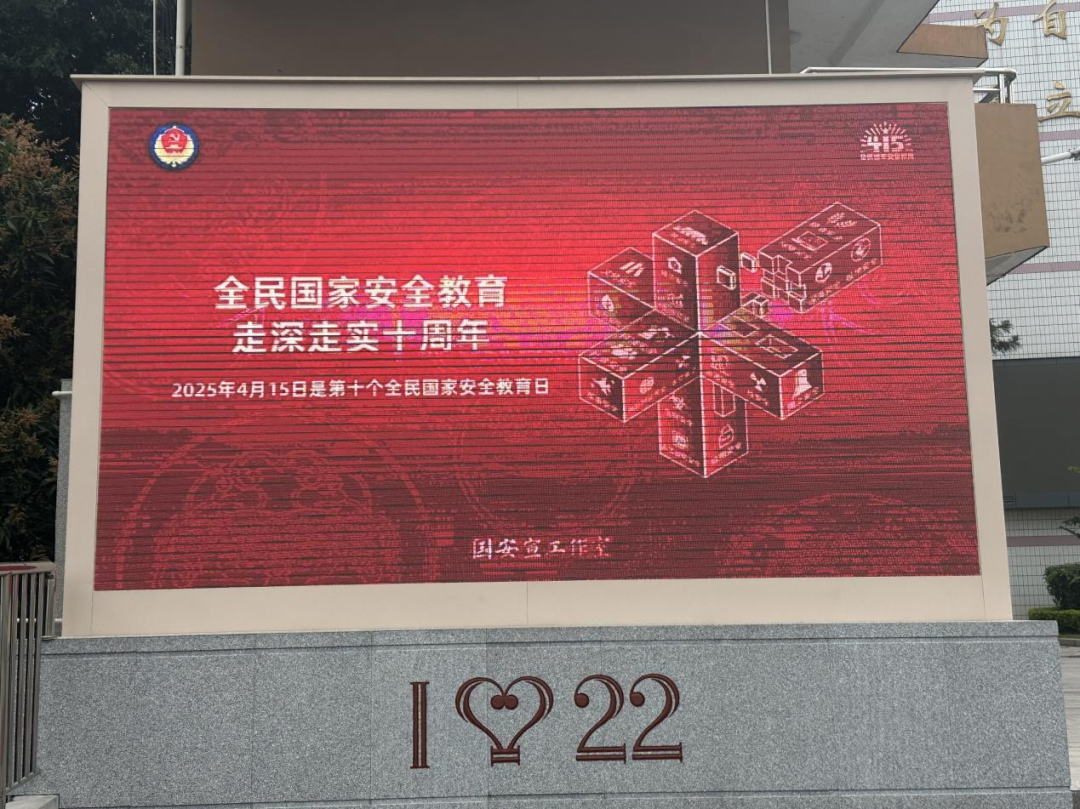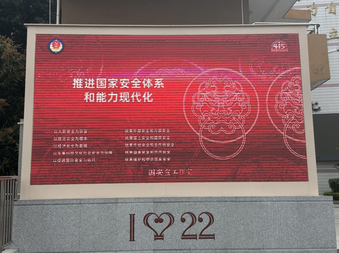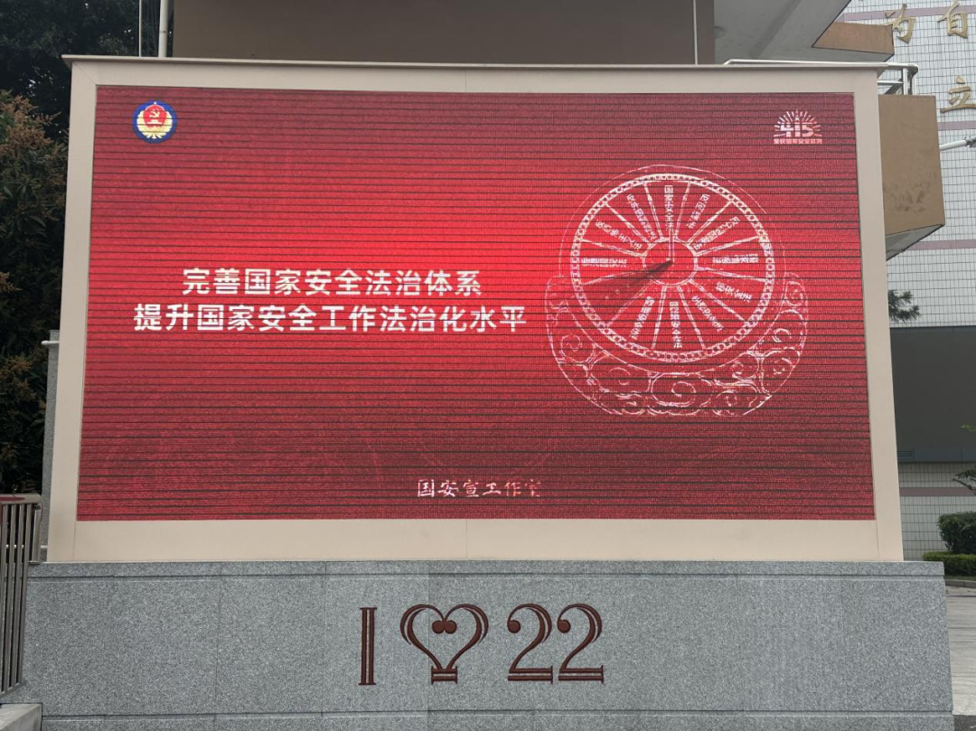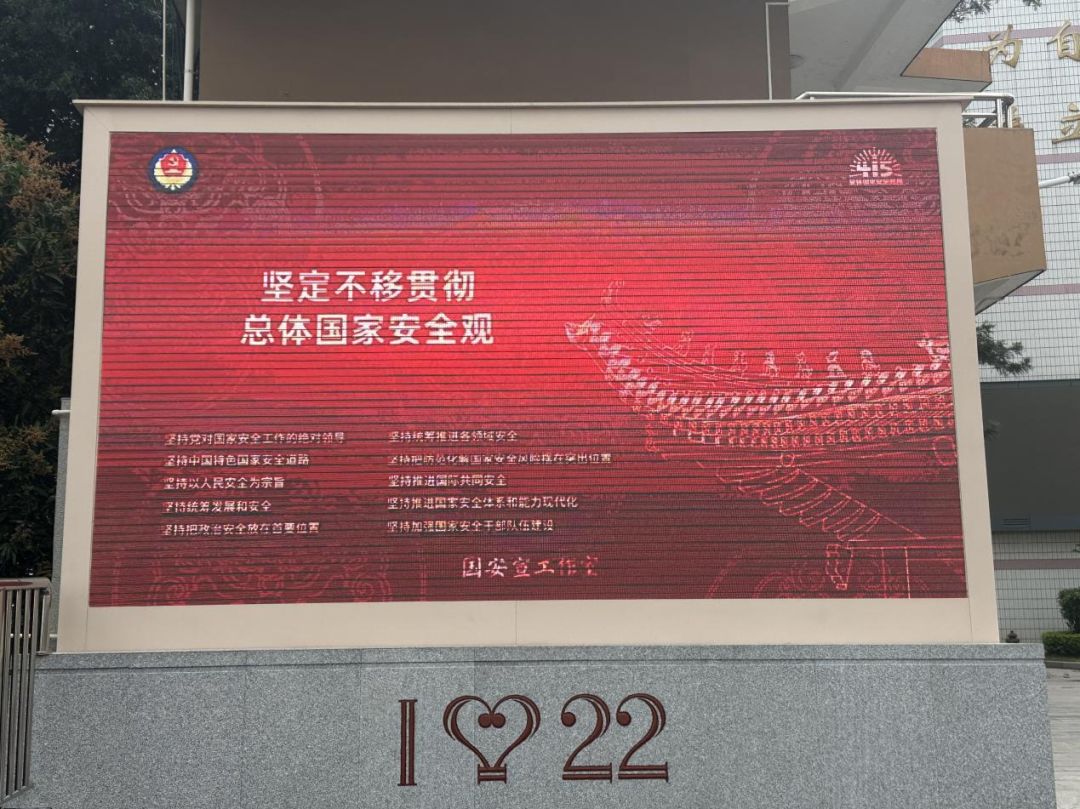 学校电子屏滚动播放国家安全相关标语,希望全体师生积极主动学习国家安全相关法律法规,从自身点滴做起,时刻保持警惕,自觉抵制任何危害国家安全的行为,共同守护国家利益。