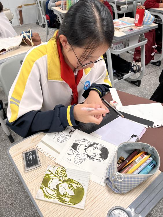进入创作阶段,同学们的想象力如泉涌般迸发。有的同学独具匠心,将校徽与美术教室的图像巧妙融合,展现出对校园生活的热爱;有的同学笔触细腻,描绘出一片浩瀚而神秘的星空,仿佛带领大家遨游于宇宙的深邃之中;还有的同学别出心裁,为自己创作了双面自画像,展现出对自我形象的多面理解与艺术表达。
