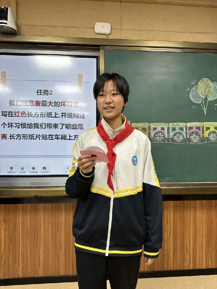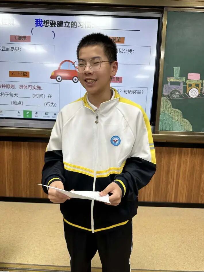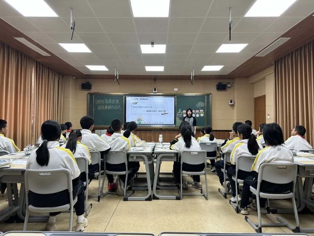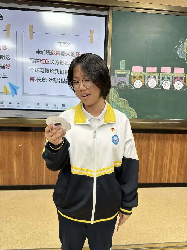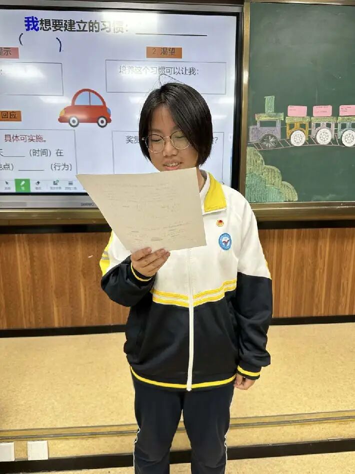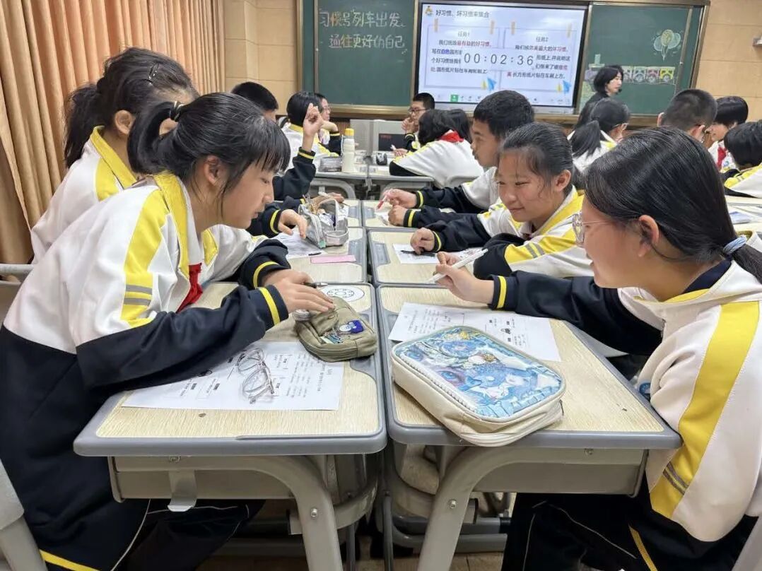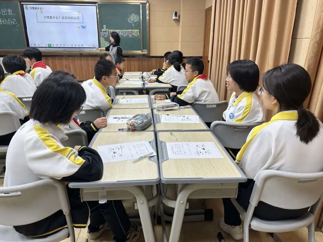 初二(1)班班主任陈虹老师以“习惯号成长列车,通往更好的自己”为主题,带来了一堂生动而富有意义的班会课。陈虹老师通过“小象的故事”、“习惯的力量”、“好习惯、坏习惯来集合”、“如何养成良好习惯”、“养成良好习惯计划书”五个环节引导学生认识习惯的重要性,发现身边的好习惯和坏习惯,并学习如何养成良好的学习习惯。
