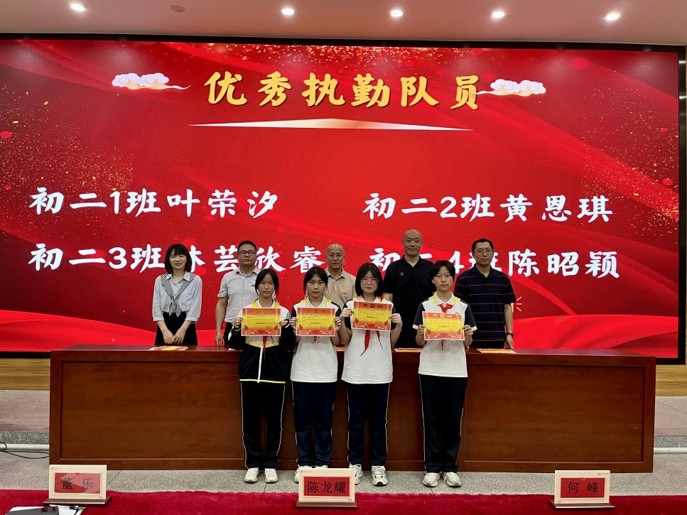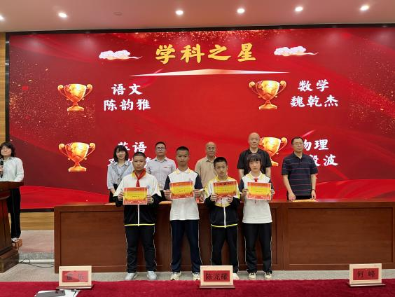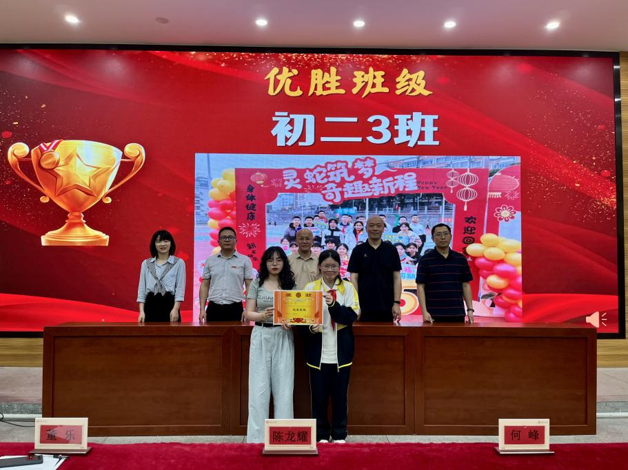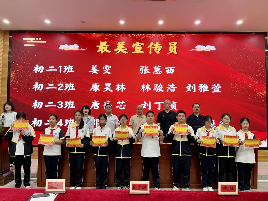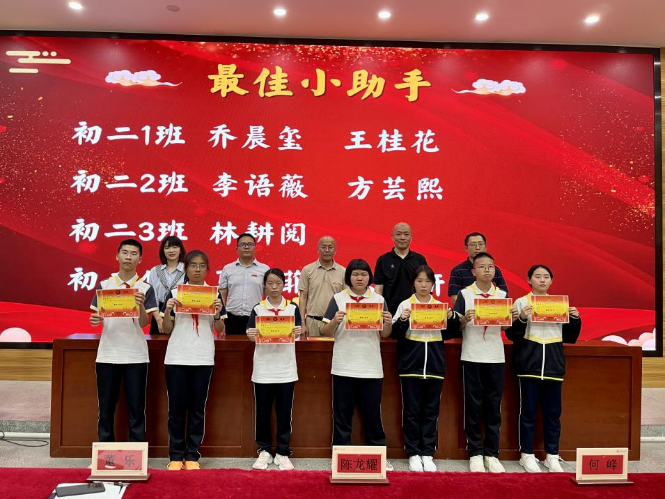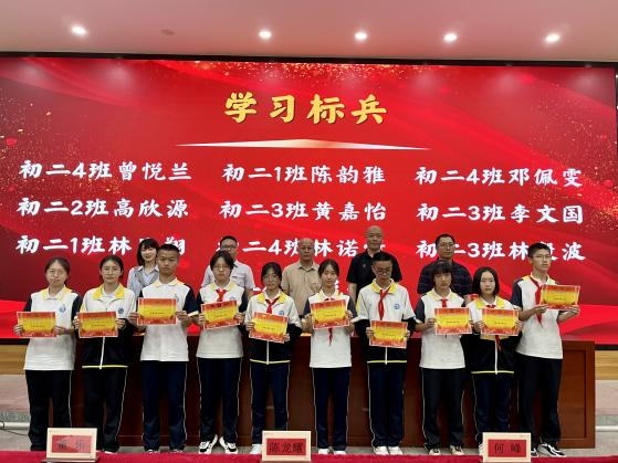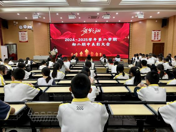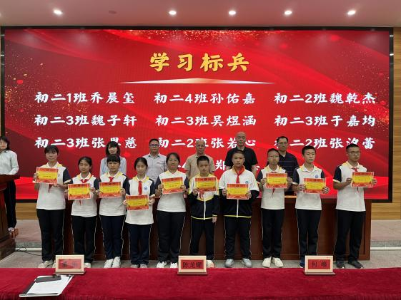 鲜衣怒马少年时,不负韶华行且知。半学期来,在初二全体师生的不懈努力、全力拼搏下,涌现出一批学习刻苦、成绩优异、进步显著的同学。本次表彰设置“学习标兵”、“学科之星”、“进步之星”、“最美宣传员”、“优秀执勤队员”、“手作达人”、“配音达人”、“最佳小助手”、“优胜班级”等多个奖项,在激昂的乐声中,获奖学生在教师带领下有序上台,领导们为获奖学生颁奖并合影。