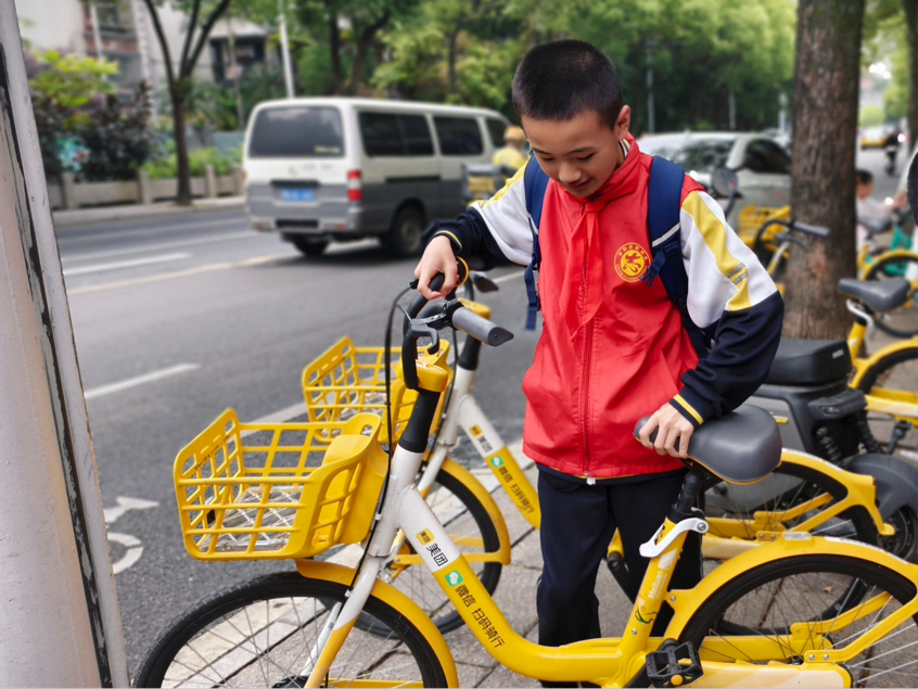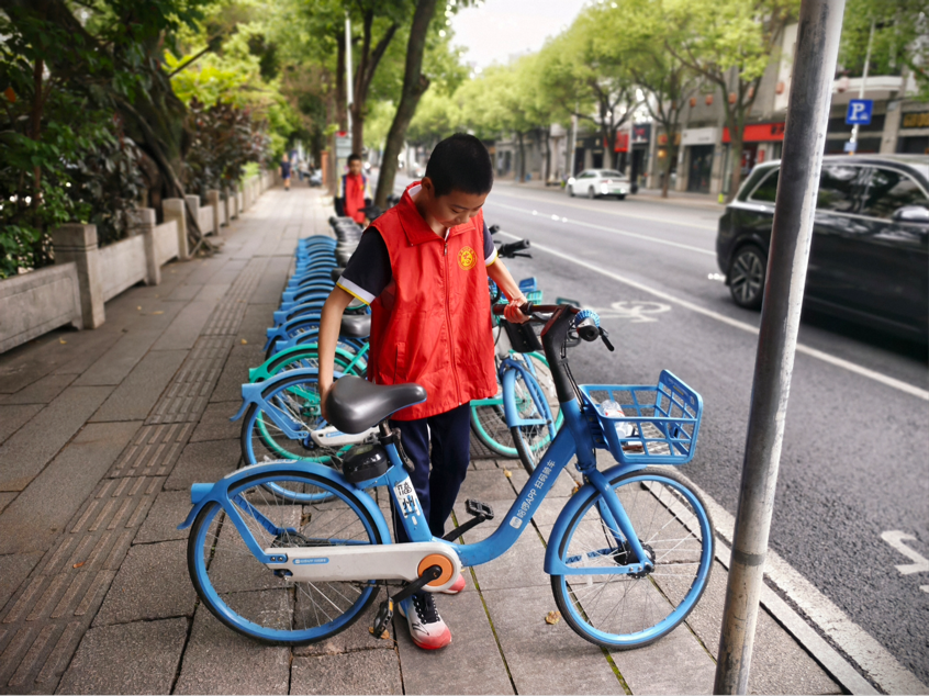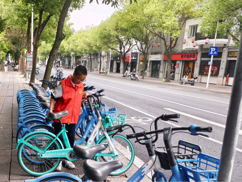 单车整理组的志愿者们将散乱的共享单车一一归位、摆放整齐,确保道路的整洁。