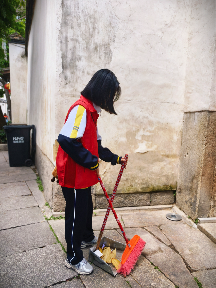 参观展览结束后,志愿者们立即投入到志愿活动中。她们身着鲜红马甲,带着扫帚、垃圾夹、手套等,兵分两路,各司其职,为坊巷的整洁贡献自己的力量。