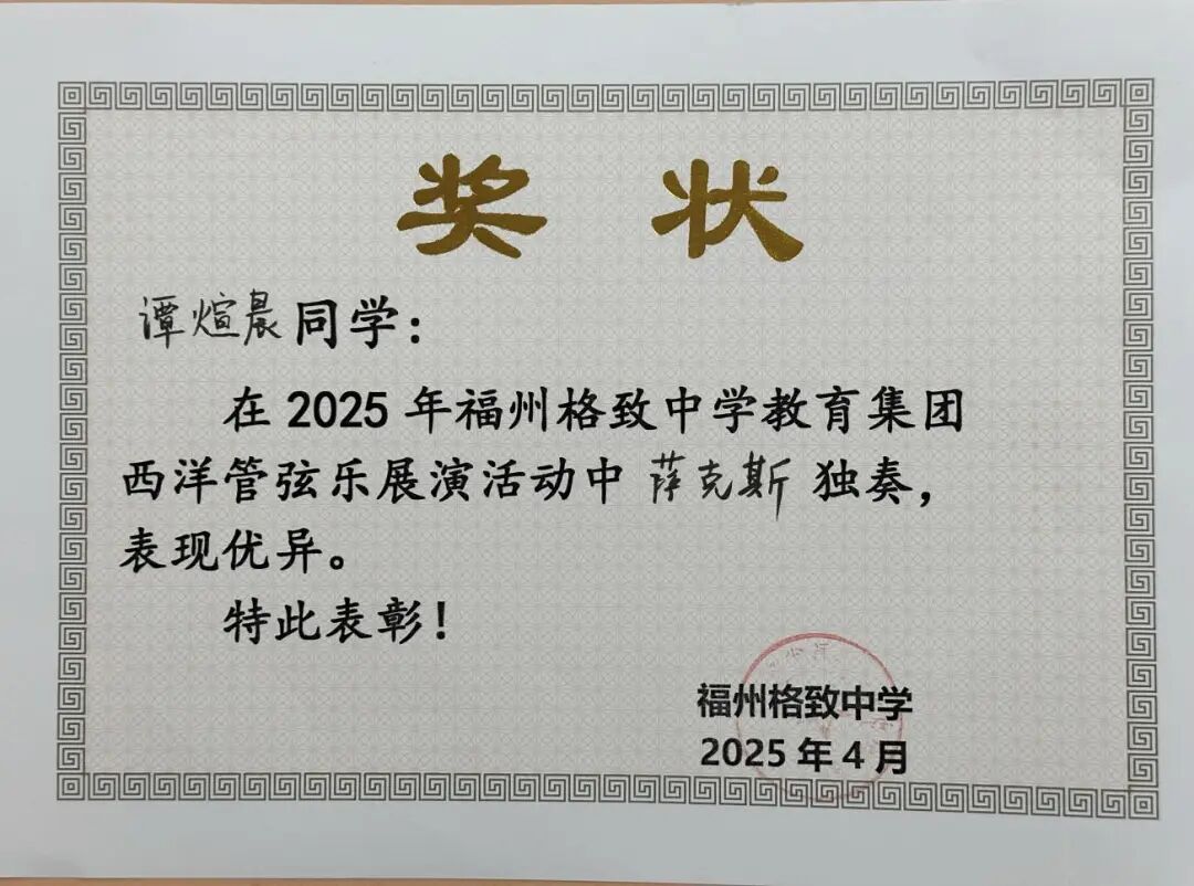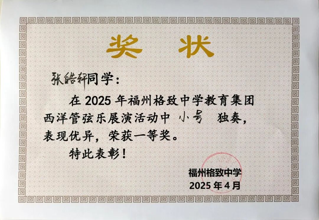 福州格致中学教育集团西洋管弦乐展演活动获奖奖状