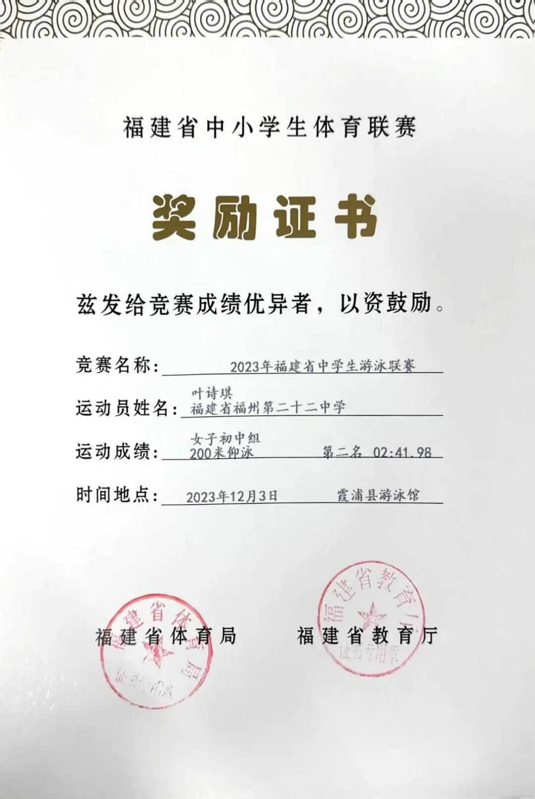 我校选手叶诗琪荣获2023年福建省中小学生游泳联赛女子初中组200米仰泳比赛第二名!