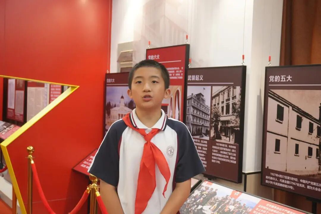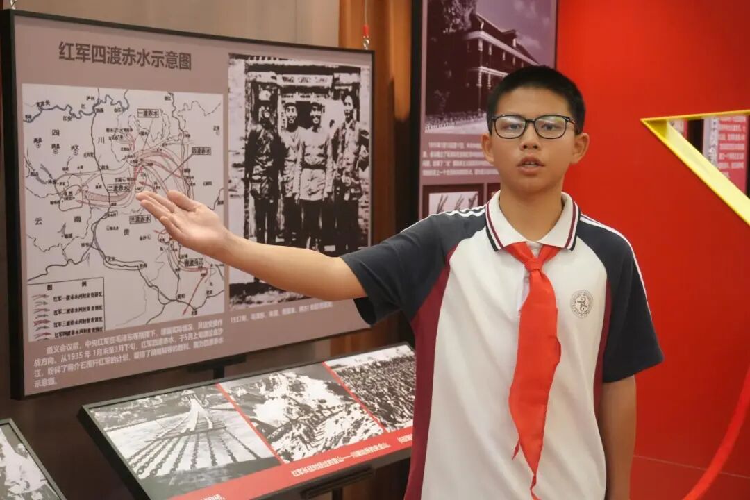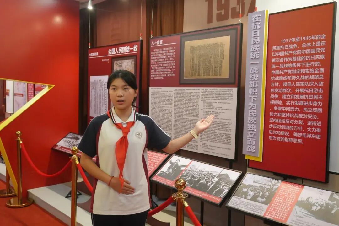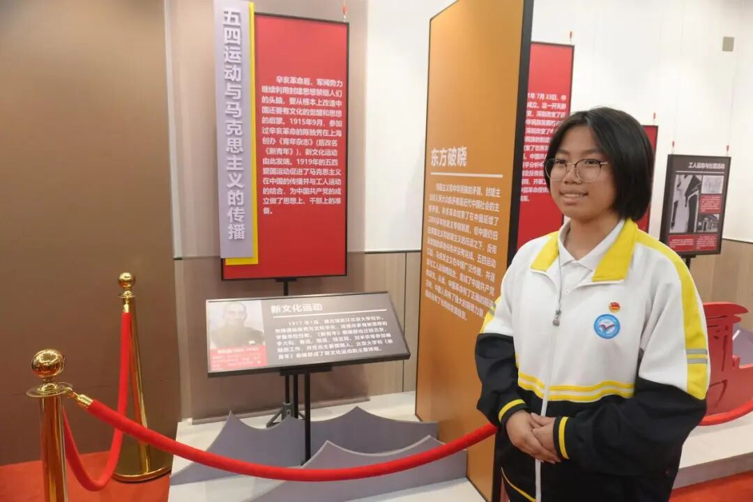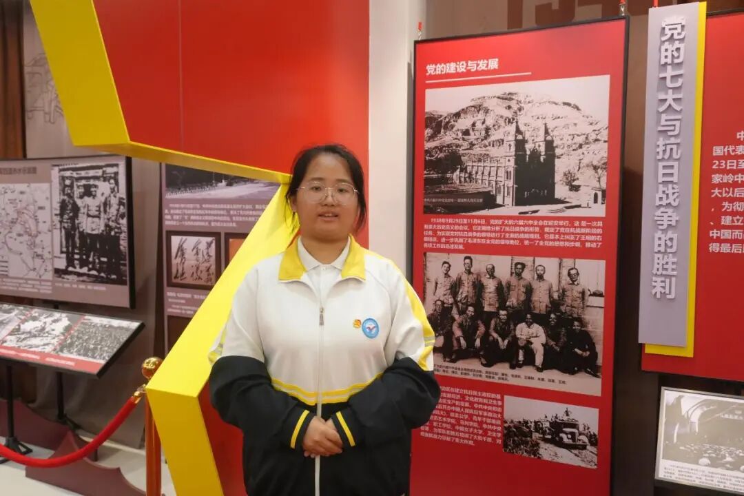 接着,在“东方破晓”展区,宣讲员兰玉香、黄嘉怡通过讲述《新青年》创办历程、李大钊与马克思主义传播等故事,重现了五四运动前后思想觉醒的历史场景;在“星火燎原”展区,宣讲员郑宇恒、车浩诚结合秋收起义、三湾改编等史料,生动诠释了“农村包围城市”革命道路的探索;在“中流砥柱”展区,宣讲员叶霖蓁、张汐蕾通过展示《中国共产党为公布国共合作宣言》等文物复制品,讲述了党在全民族抗战中的中流砥柱作用;在“夺取胜利”展区,宣讲员缪希、林毅波以三大战役、开国大典等历史事件为脉络,展现了党领导人民推翻反动统治、建立新中国的伟大历程。