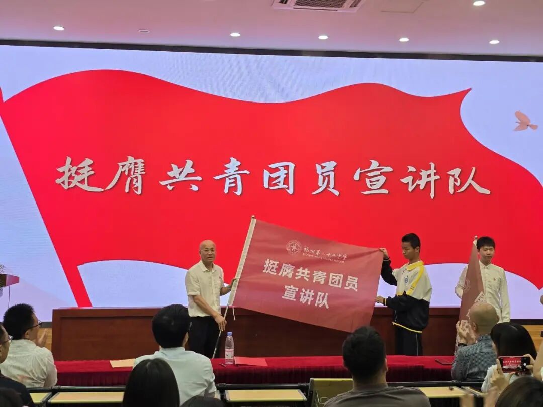 随后,陈龙耀校长将“挺膺共青团员宣讲队”旗帜授予共青团员代表林毅波,旗帜飘扬间,展现着团员青年们挺立担当的决心,他们将以青春热血,奏响红色宣讲的青春强音。