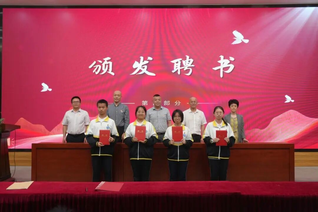 激昂振奋的背景音乐如奔涌的浪潮在会场回荡,陈琛书记、陈龙耀校长、何峰副校长分别为鸿雁青年教师宣讲团、挺膺共青团员宣讲队、逐梦少先队员宣讲队的代表们授旗。