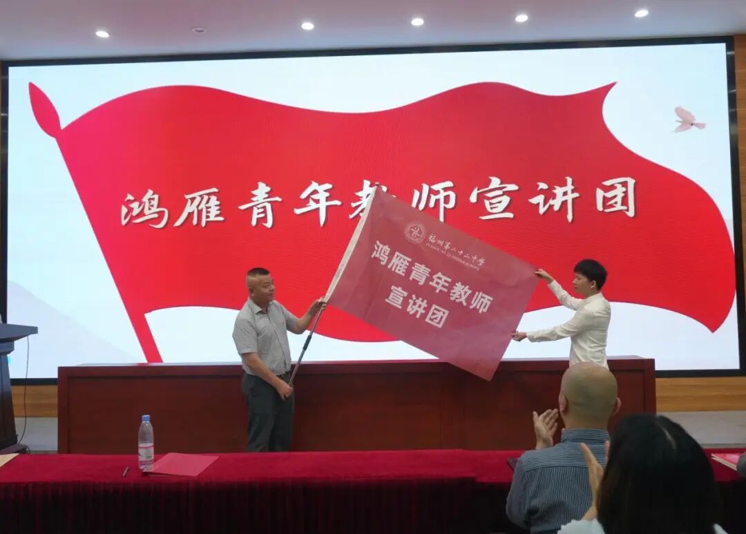 首先,陈琛书记将印着“鸿雁青年教师宣讲团”烫金字样的旗帜郑重递出,青年教师代表任斌斌双手稳稳接过,旗帜鲜红如朝阳,金色字体在灯光映射下闪耀着智慧与希望的光芒,象征着青年教师们将如鸿雁般,以深厚学识传递党的声音。