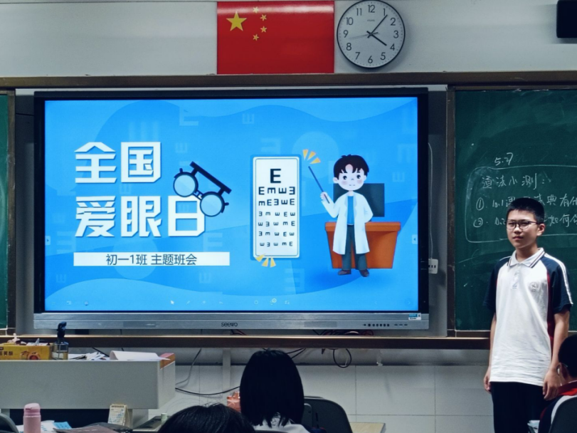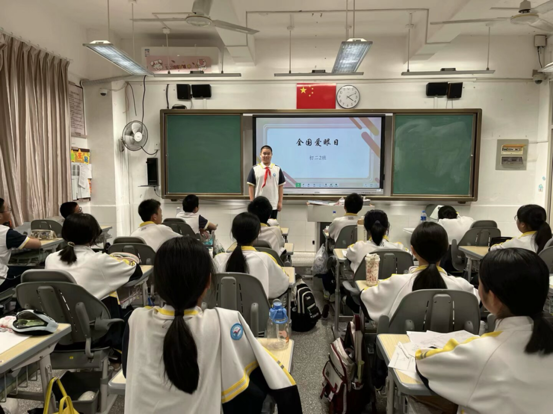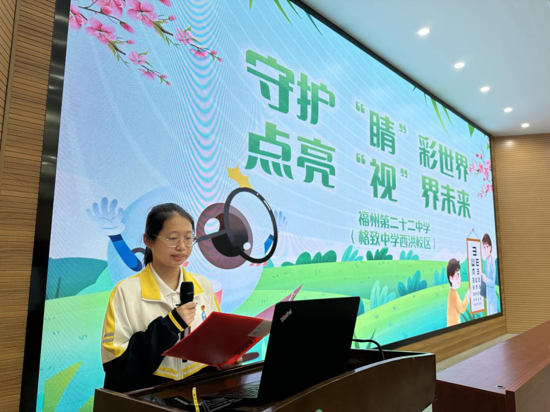 初二3班黄嘉怡同学在国旗下讲话中呼吁同学们眼睛是我们宝贵的财富,我们要像爱护生命一样爱护它。希望大家养成良好的用眼习惯,科学用眼、适当增加户外活动、合理饮食、定期检查视力、树立正确的用眼观念。相信在我们的共同努力下,我们都能拥有一双明亮、健康的眼睛,去发现生活中更多的美好!
