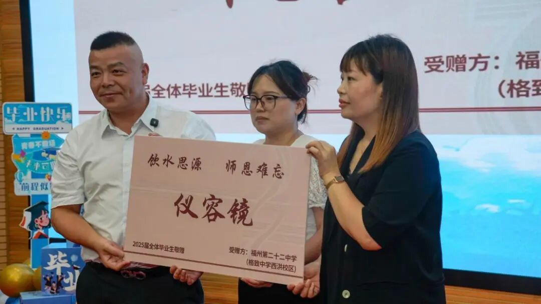 饮水思源,师恩难忘,2025届毕业生将精心挑选的仪容镜敬赠母校,以为鉴,正衣冠,显精神,树新风。陈琛书记郑重接受家长代表馈赠,这份情谊深深镌刻在校园记忆里,十年树木,百年树人。