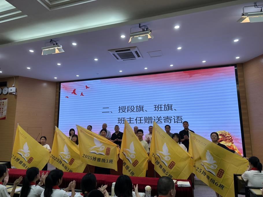 在庄重的授旗仪式上,书记陈琛亲手将印有“博雅级”的段旗交到初一年级组长手中。“博雅”二字承载着学校对新生“学识广博、品行雅正”的培养期望,鲜艳的段旗挥舞间,点燃了全体初一师生的集体荣誉感。