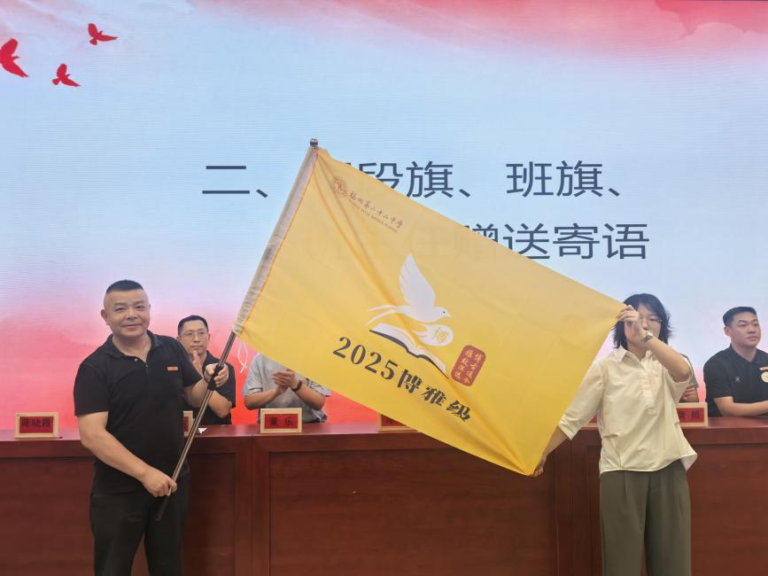 随后,校领导依次为各班授予班旗,班主任们昂首挺胸接过班旗,这面班旗将成为班级凝聚力的象征,陪伴同学们共同成长。