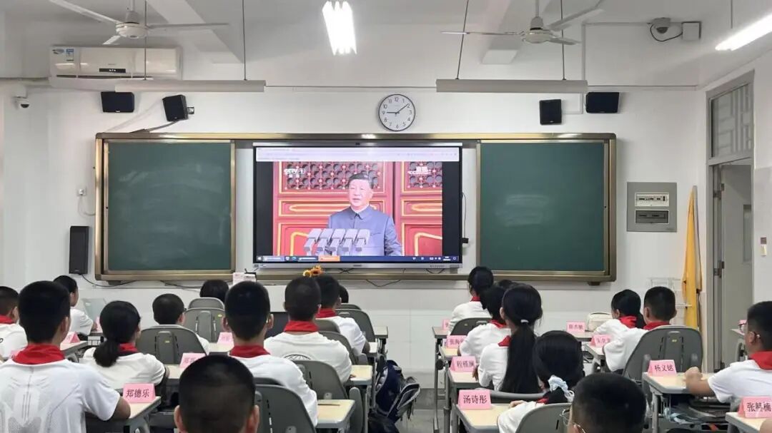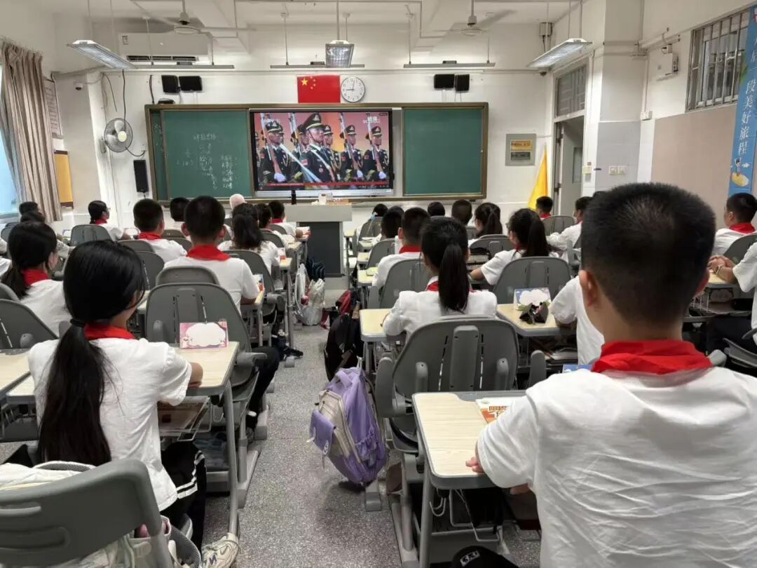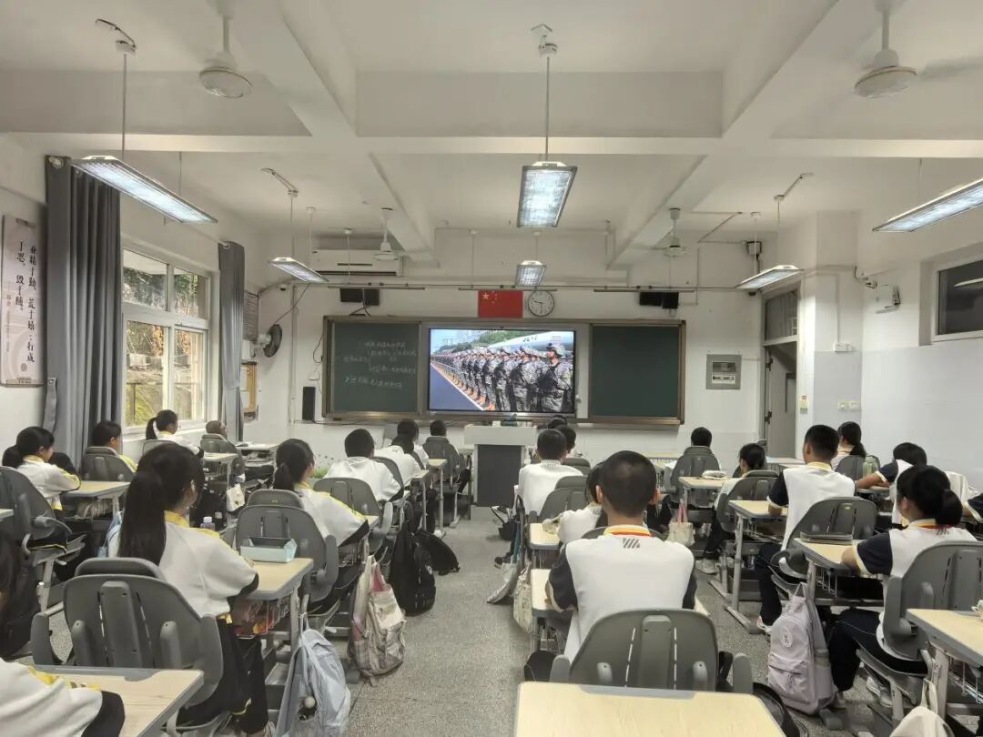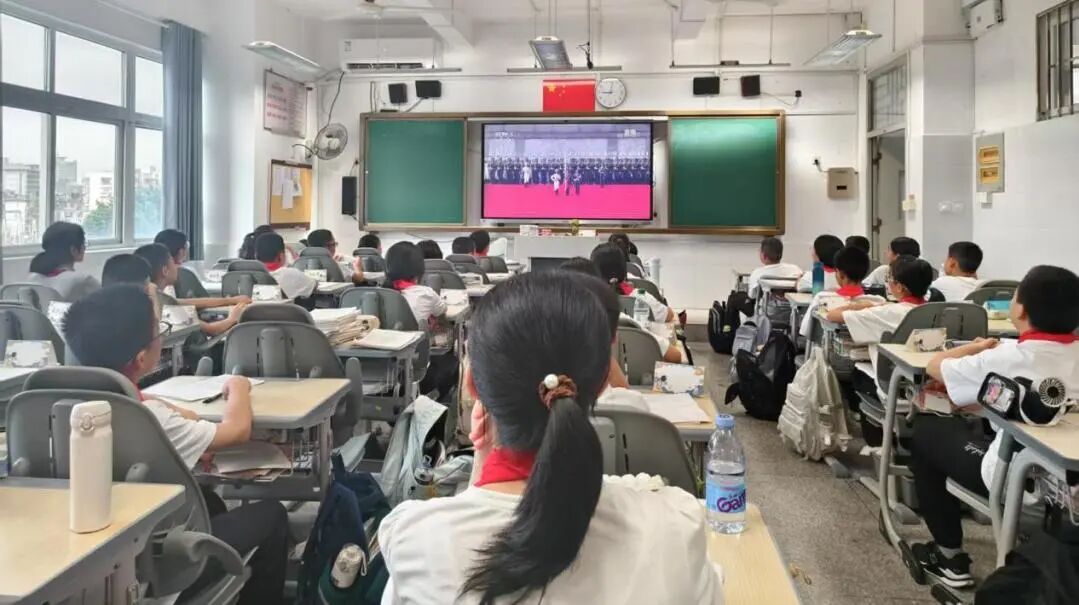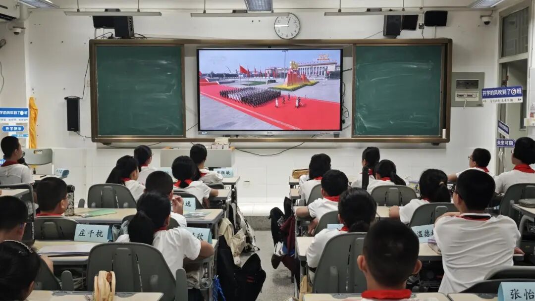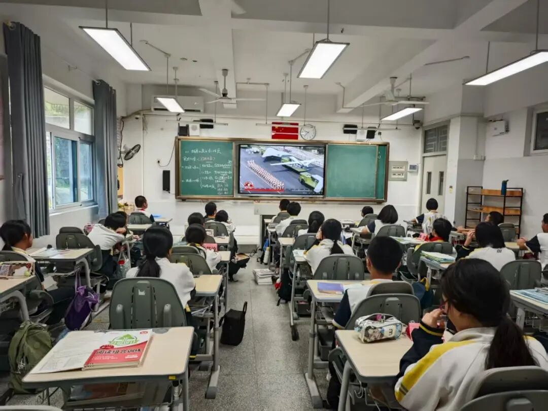 在各个班级教室里,学生们的表现同样令人感动。在班主任的组织下,同学们整齐端坐,目光聚焦于电子白板上的直播画面。当空中护旗梯队飞过时,男生们发出声声欢呼;当战旗方队出现时,教室里响起持久而热烈的掌声;当装备方队亮相时,同学们为国家的强大所折服,纷纷发出阵阵惊叹。这些生长于和平年代的孩子,通过这场阅兵仪式直观感受到了国家的强盛与民族的尊严。