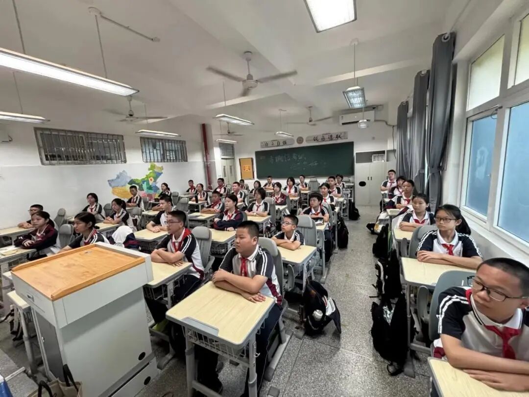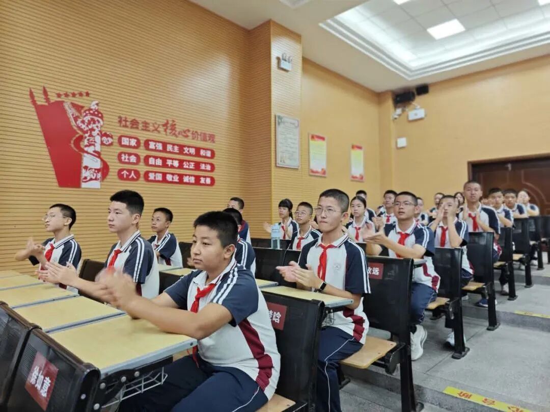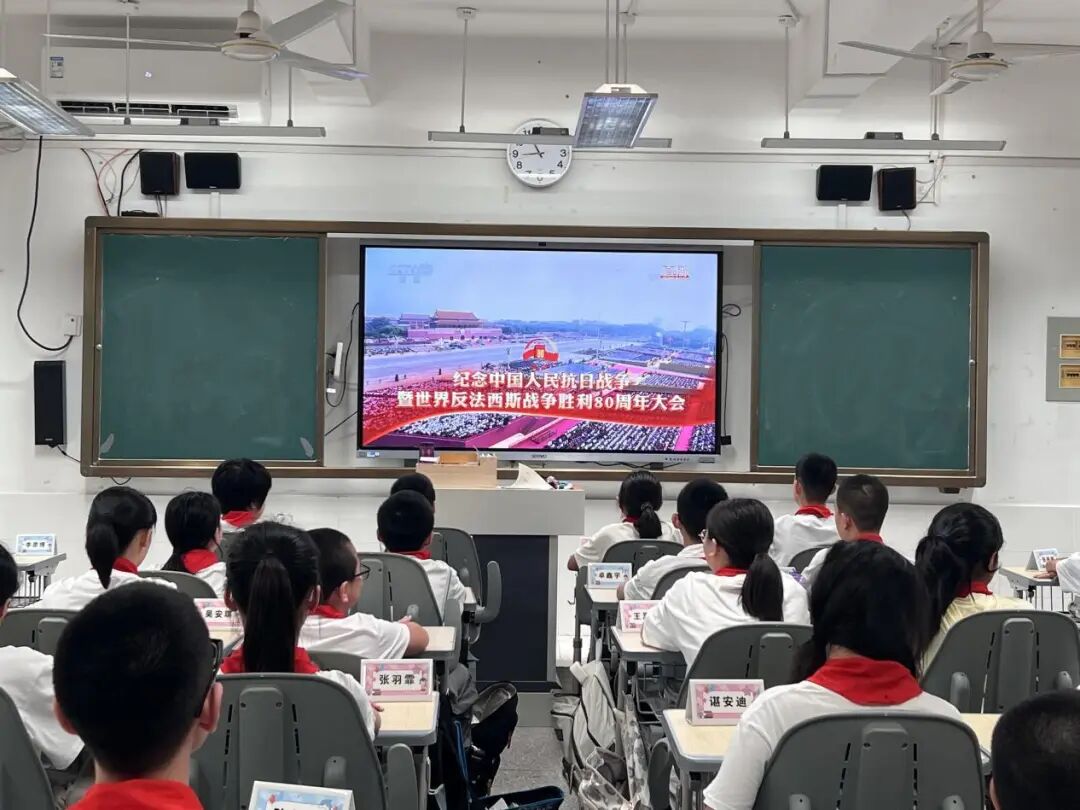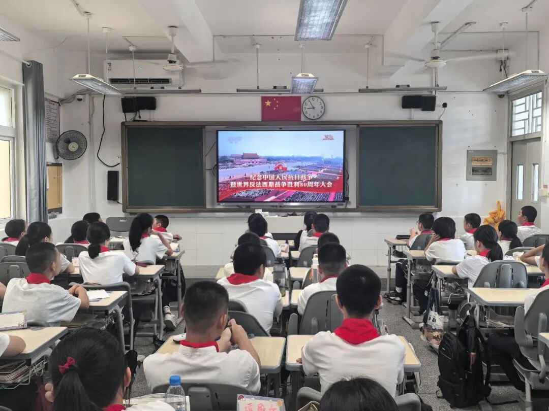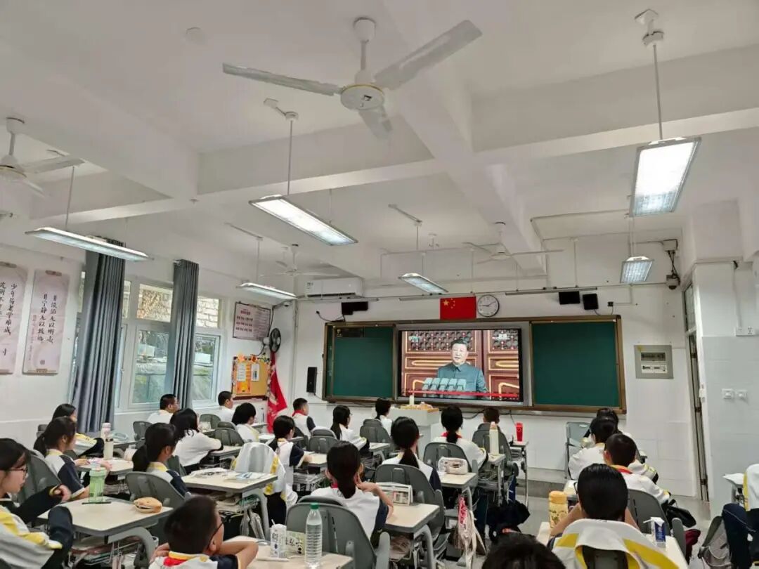 在各个班级教室里,学生们的表现同样令人感动。在班主任的组织下,同学们整齐端坐,目光聚焦于电子白板上的直播画面。当空中护旗梯队飞过时,男生们发出声声欢呼;当战旗方队出现时,教室里响起持久而热烈的掌声;当装备方队亮相时,同学们为国家的强大所折服,纷纷发出阵阵惊叹。这些生长于和平年代的孩子,通过这场阅兵仪式直观感受到了国家的强盛与民族的尊严。