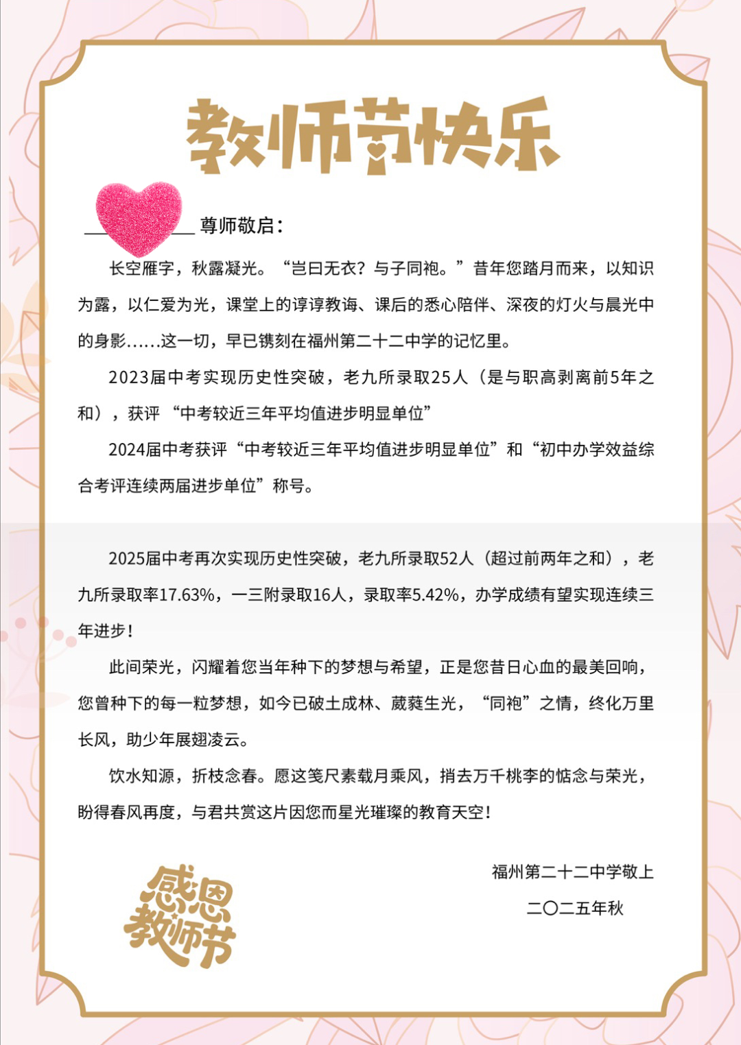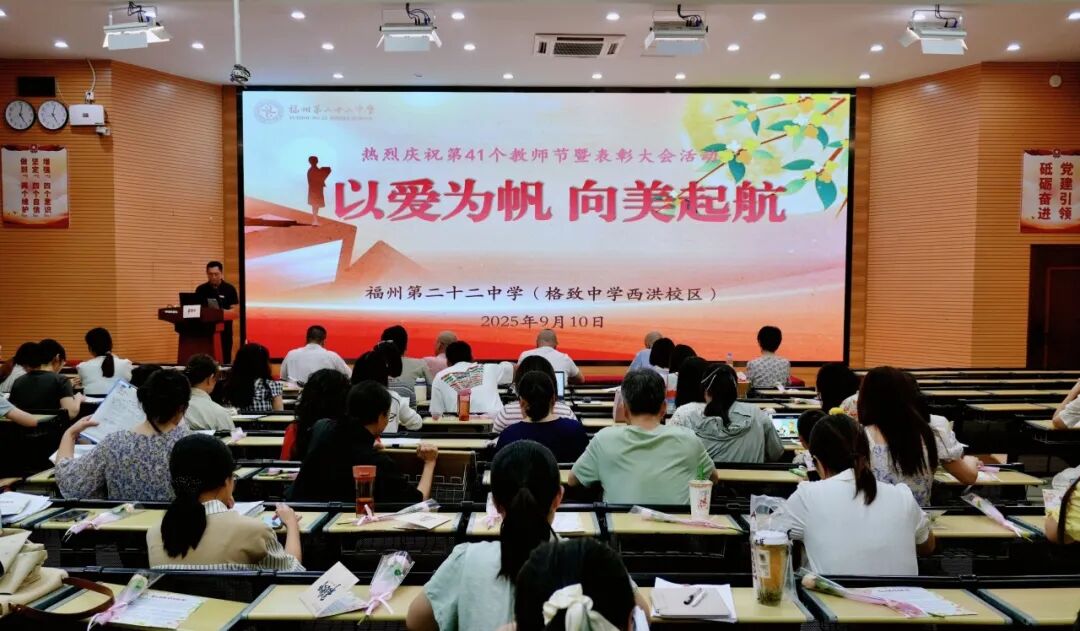 金秋九月,丹桂溢香;玉兰吐蕊,书声悠扬。9月10日下午,点点taptap官网(格致中学西洪校区)满溢着敬意与温暖,全体教职工齐聚一堂举行“以爱为帆,向美起航”庆祝第41个教师节暨表彰大会。本次活动以“以教育家精神铸魂强师,谱写教育强国建设华章”为内核,既致敬坚守与付出,更凝聚“以爱育爱”的力量,为新学期的教育征程注入温暖而坚定的动力。