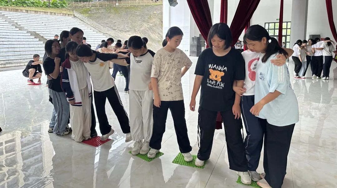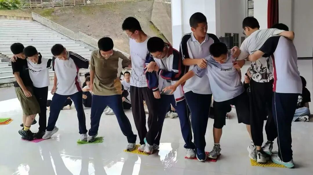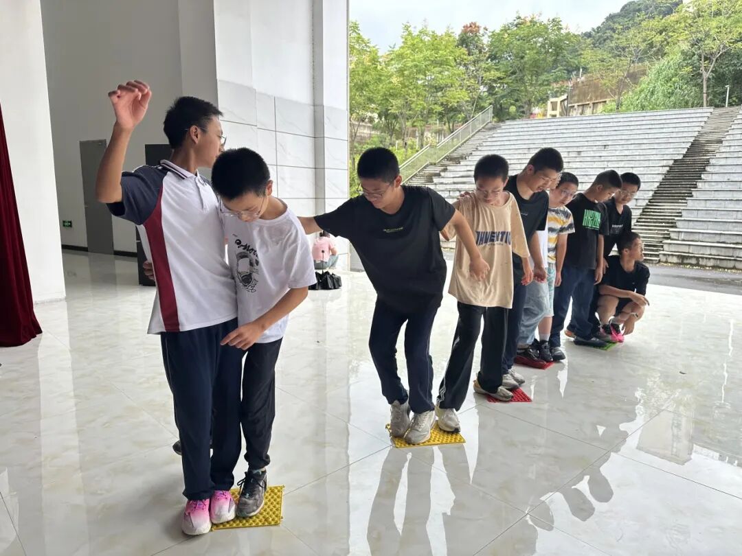 学生以小组形式在有限面积的指压板垫上协同行进,过程中需相互扶持、保持平衡,模拟“穿越硫酸海域”的紧张情境。活动现场气氛热烈,参与者全心投入,在协作中体会到信任与责任的重要性。该活动既考验默契又充满乐趣,让同学们更深刻理解了团队力量的意义。