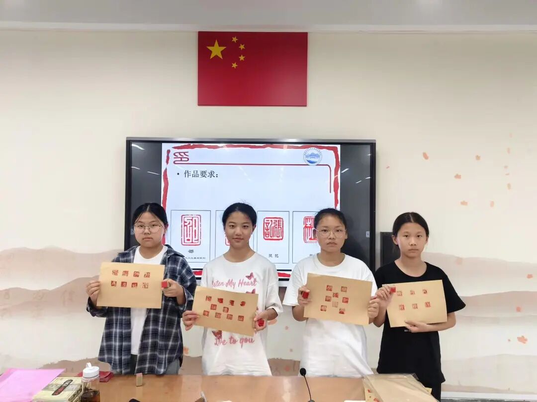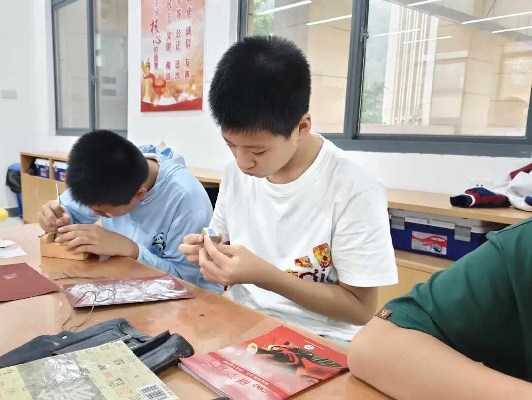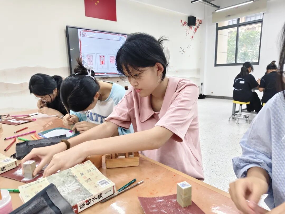 他们专注投入篆刻实践,手持刻刀与印石,在工具辅助下细致完成每一道工序。同学们沉浸于传统技艺的独特魅力,表现出浓厚的学习热情和精益求精的工匠精神。大家通过亲身操作,不仅加深了对篆刻艺术的理解,更体会到耐心、专注与传承的重要性。