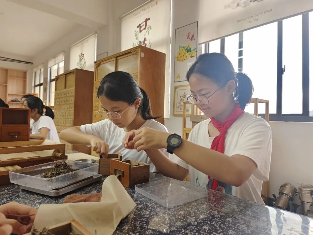 同学们在老师的指导下,亲身体验了从称量艾草、揉搓香料到使用传统木制工具进行定形、捆扎的完整制香工序。他们通过亲手实践,不仅学习了艾香的制作技艺,更深刻感受到了非遗文化所蕴含的严谨、细致的工匠精神。