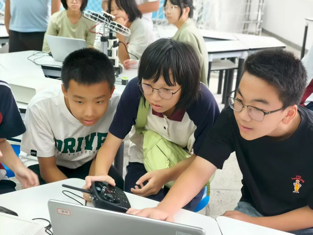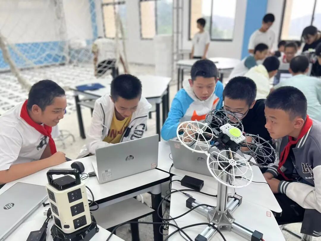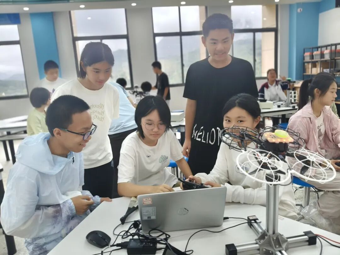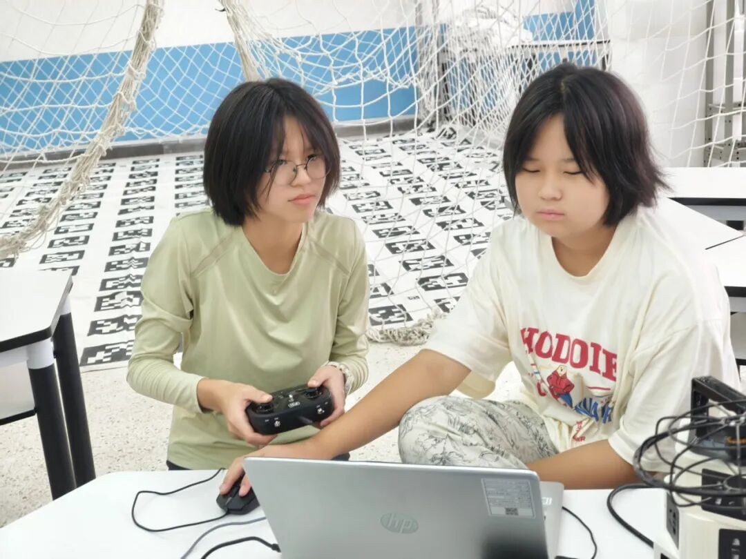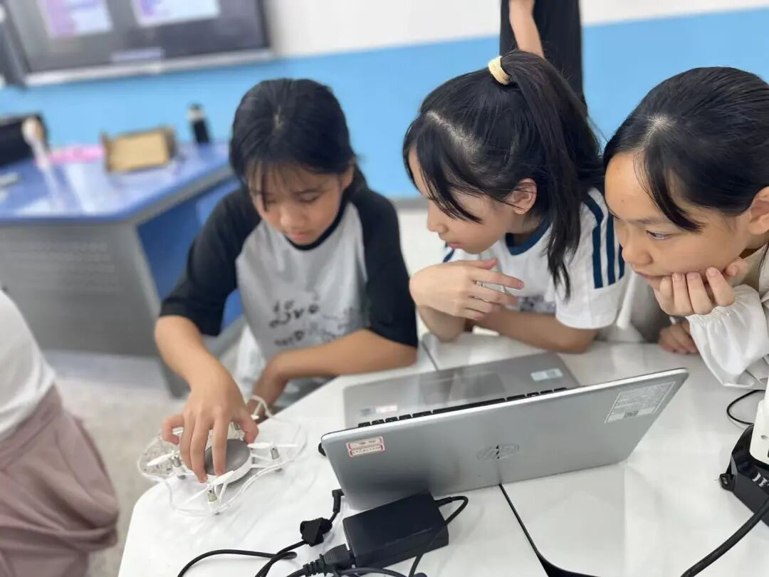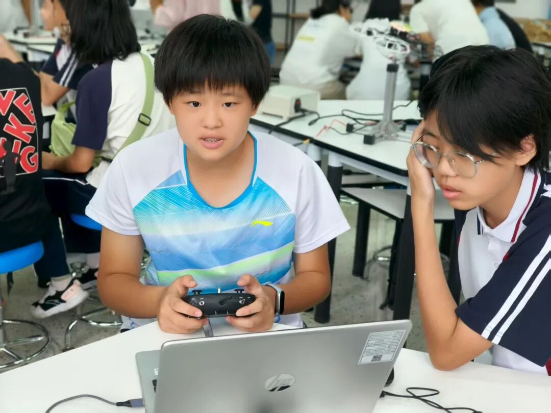 学生们以小组为单位分工合作,通过笔记本电脑编写程序,操控无人机完成航线挑战任务。他们专注地调试设备、讨论方案,在网状围栏保护的试飞区内进行多次实践。现场气氛热烈,充满探索与协作的热情。活动不仅锻炼了编程思维和动手能力,更体验到科技实践的乐趣与团队合作的重要性。