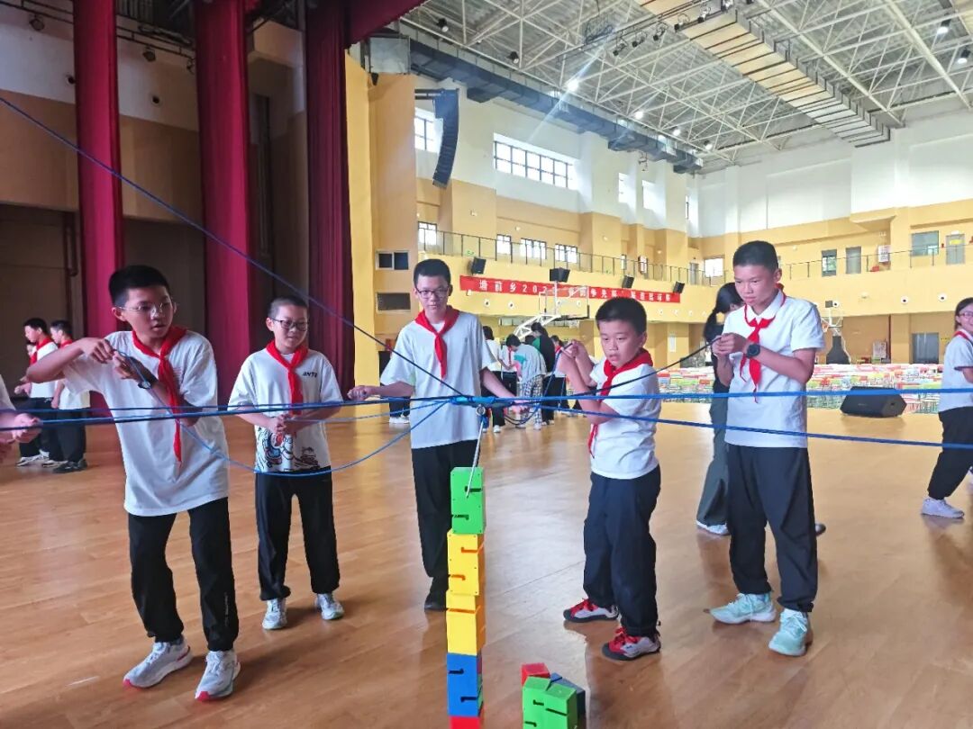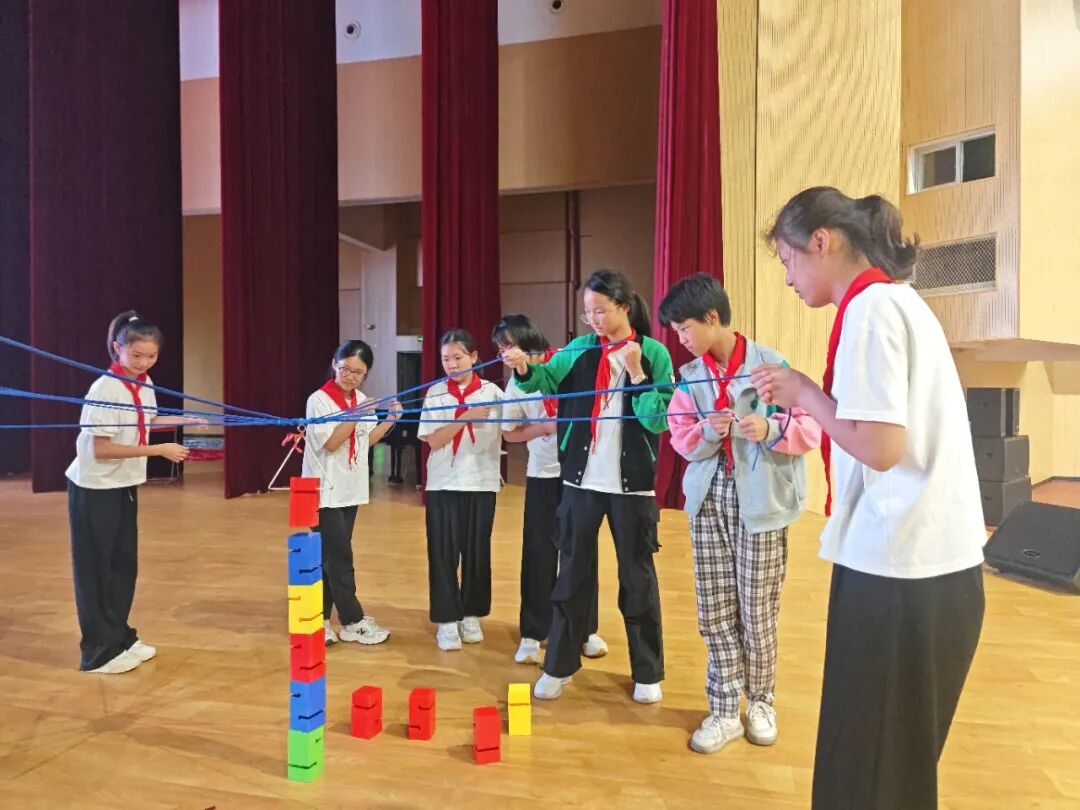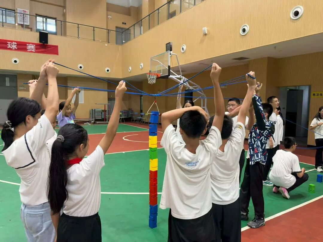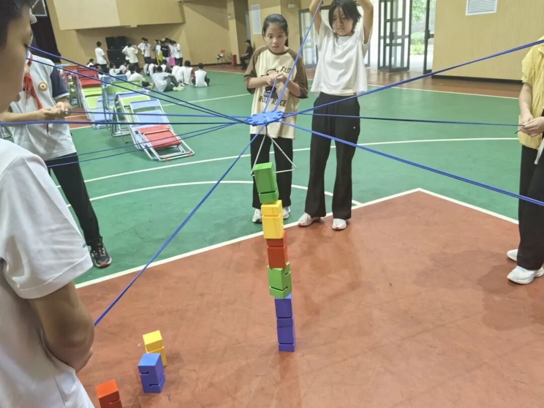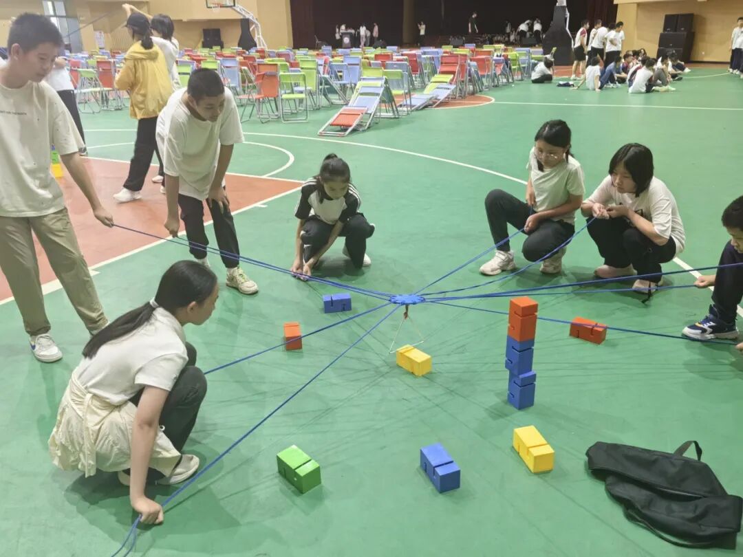 学生们以小组为单位,通过手中牵引的蓝色绳索,共同操控中央吊架,将一块块彩色积木精准堆叠成塔。活动中,每位成员都需要高度集中注意力,通过默契配合与精准发力来控制积木的平衡与稳定。同学们在协作中深刻体会到沟通与信任的重要性。