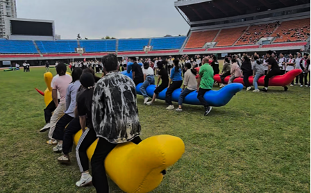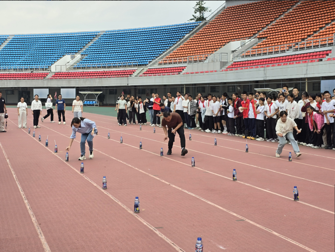 在旱地龙舟项目中,各支教职工队伍的选手们齐心协力,喊着整齐的口号,迈着一致的步伐向前冲。龙舟在赛道上快速移动,仿佛真的在水面上破浪前行。团队成员彼此信任、相互配合,为了共同的目标全力以赴。